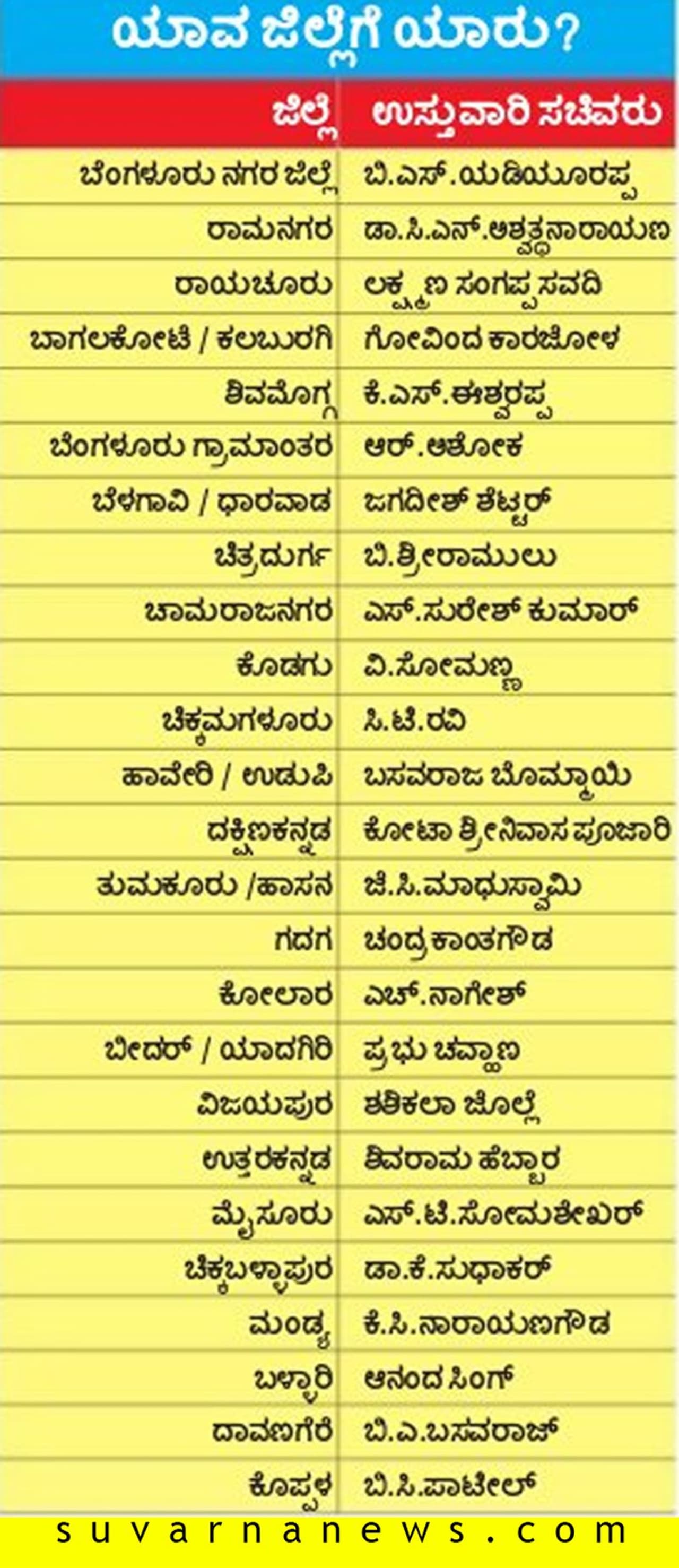 ಮುಖ್ಯಮಂತ್ರಿ ಯಡಿಯೂರಪ್ಪ ಜಿಲ್ಲಾ ಉಸ್ತುವಾರಿ ಹೊಣೆ ನೀಡಿದ ಸಚಿವರ ಪಟ್ಟಿ ಹೀಗಿದೆ..