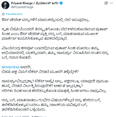 ಪ್ರತಾಪ್ ಸಿಂಹ ಮತ್ತು ಪ್ರಿಯಾಂಕ್ ಖರ್ಗೆ ನಡುವಿನ ಮಾತಿನ ಸಮರವು ಟ್ವಿಟರ್ನಲ್ಲಿ ಮುಂದುವರೆದಿದೆ. ಪ್ರಿಯಾಂಕ್ ಖರ್ಗೆ ಅವರ ಹೆಸರನ್ನು ಪ್ರಸ್ತಾಪಿಸಿ ವ್ಯಂಗ್ಯವಾಡಿದ ಪ್ರತಾಪ್ ಸಿಂಹಗೆ ಖರ್ಗೆ ತಿರುಗೇಟು ನೀಡಿದ್ದಾರೆ.