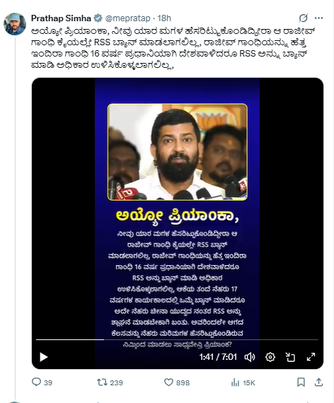 ಇದಕ್ಕೂ ಮುನ್ನ ಪ್ರಿಯಾಂಕ್ ಖರ್ಗೆ ಕುರಿತಾಗಿ ಮಾತನಾಡಿದ್ದಸ ಪ್ರತಾಪ್ ಸಿಂಹ, 'ಅಯ್ಯೋ ಪ್ರಿಯಾಂಕಾ, ನೀವು ಯಾರ ಮಗಳ ಹೆಸರಿಟ್ಟುಕೊಂಡಿದ್ದೀರಾ ಆ ರಾಜೀವ್ ಗಾಂಧಿ ಕೈಯಲ್ಲೇ RSS ಬ್ಯಾನ್ ಮಾಡಲಾಗಲಿಲ್ಲ, ರಾಜೀವ್ ಗಾಂಧಿಯನ್ನು ಹೆತ್ತ ಇಂದಿರಾ ಗಾಂಧಿ 16 ವರ್ಷ ಪ್ರಧಾನಿಯಾಗಿ ದೇಶವಾಳಿದರೂ RSS ಅನ್ನು ಬ್ಯಾನ್ ಮಾಡಿ ಅಧಿಕಾರ ಉಳಿಸಿಕೊಳ್ಳಲಾಗಲಿಲ್ಲ, ಆಕೆಯ ತಂದೆ ನೆಹರು 17 ವರ್ಷಗಳ ಕಾರ್ಯಕಾಲದಲ್ಲಿ ಒಮ್ಮೆ ಬ್ಯಾನ್ ಮಾಡಿದರೂ ಅದೇ ನೆಹರು ಚೀನಾ ಯುದ್ಧದ ನಂತರ RSS ಅನ್ನು ಶ್ಲಾಘನೆ ಮಾಡಬೇಕಾಗಿ ಬಂತು. ಅವರಿಂದಲೇ ಆಗದ ಕೆಲಸವನ್ನು ನೆಹರು ಮರಿಮಗಳ ಹೆಸರಿಟ್ಟುಕೊಂಡಿರುವ ನಿಮ್ಮಿಂದ ಮಾಡಲು ಸಾಧ್ಯವೇನ್ರಿ ಪ್ರಿಯಾಂಕ?' ಎಂದು ಪ್ರಶ್ನೆ ಮಾಡಿದ್ದರು.