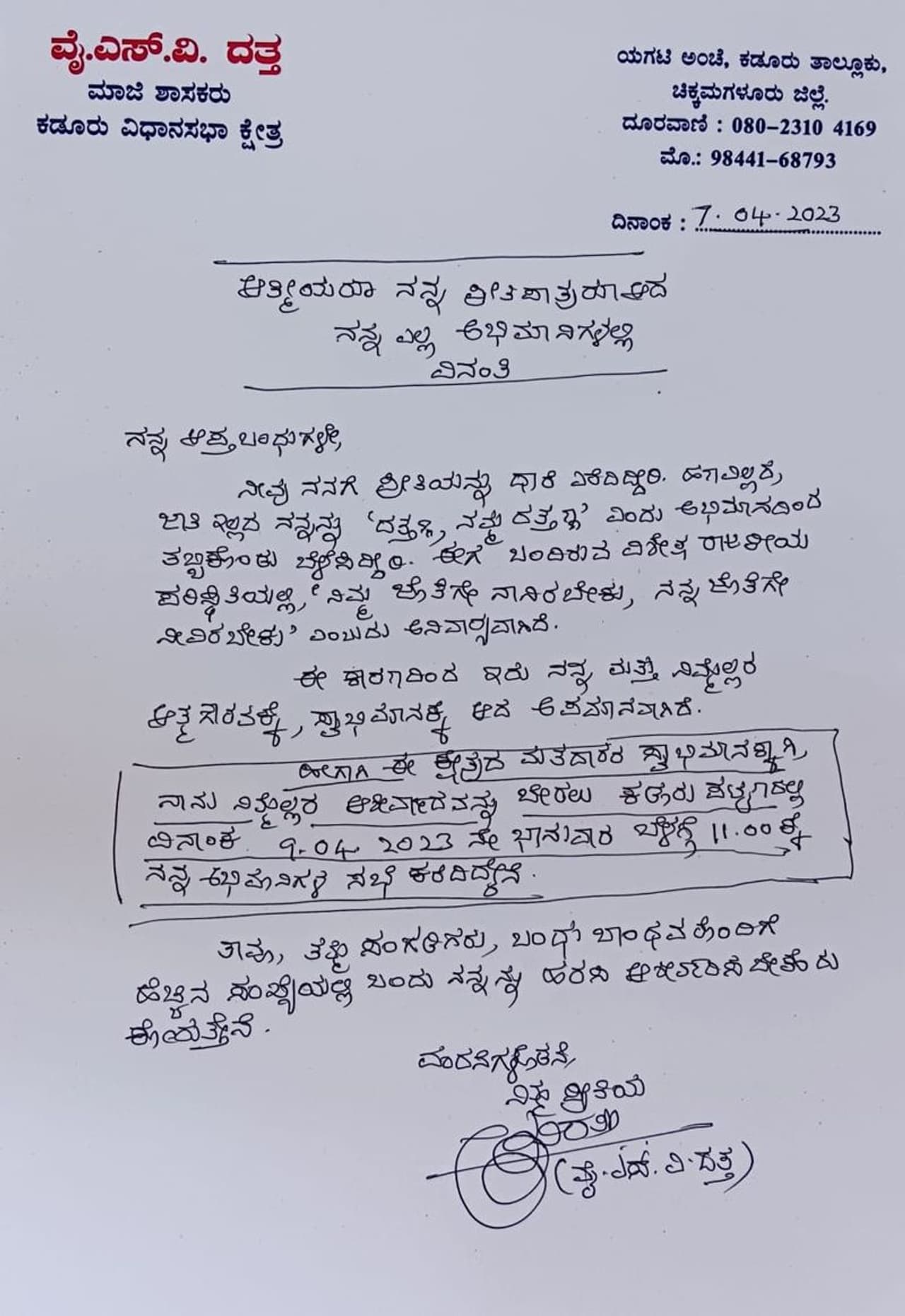 ಈ ನಡುವೆ ವೈಎಸ್ವಿ ದತ್ತ ಅವರು ಅಭಿಮಾನಿಗಳಿಗೆ ಪತ್ರವೊಂದನ್ನು ಬರದಿದ್ದು ಅದರ ಒಕ್ಕಣೆ ಹೀಗಿದೆ.ಆತ್ಮೀಯ ನನ್ನ ಪ್ರೀತಿಪಾತ್ರರಾದ ಎಲ್ಲ ಅಭಿಮಾನಿಗಳಲ್ಲಿ ವಿನಂತಿ, ನೀವು ನನಗೆ ಪ್ರೀತಿಯನ್ನು ಧಾರೆ ಎರೆದಿದ್ದೀರಿ. ಹಣವಿಲ್ಲದ, ಜಾತಿ ಇಲ್ಲದ ನನ್ನನ್ನು ದತ್ತ, ದತ್ತಣ್ಣ ಎಂದು ಅಭಿಮಾನದಿಂದ ತಬ್ಬಿಕೊಂಡು ಬೆಳೆಸಿದ್ದೀರಿ. ಈಗ ಬಂದಿರುವ ವಿಶೇಷ ರಾಜಕೀಯ ಪರಿಸ್ಥಿತಿಯಲ್ಲಿ ನಿಮ್ಮ ಜೊತೆಗೆ ನಾನಿರಬೇಕು, ನನ್ನ ಜೊತೆ ನೀವಿರಬೇಕು ಎನ್ನುವುದು ಅನಿವಾರ್ಯವಾಗಿದೆ. ಈ ಕಾರಣದಿಂದ ಇದು ನನ್ನ ಮತ್ತು ನಿಮ್ಮೆಲ್ಲರ ಆತ್ಮಗೌರವಕ್ಕೆ, ಸ್ವಾಭಿಮಾನಕ್ಕೆ ಆದ ಅಪಮಾನವಾಗಿದೆ. ಹೀಗಾಗಿ ಈ ಕ್ಷೇತ್ರದ ಮತದಾರರ ಸ್ವಾಬಿಮಾನಕ್ಕಾಗಿ ನಾನು ನಿಮ್ಮೆಲ್ಲರ ಆಶೀರ್ವಾದ ಬೇಡಲು ಕಡೂರು ಪಟ್ಟಣದಲ್ಲಿ ಏಪ್ರಿಲ್ 9 ರಂದು ಬೆಳಗ್ಗೆ 11 ಕ್ಕೆ ನ್ನ ಅಭಿಮಾನಿಗಳ ಸಭೆ ಕರೆದಿರುತ್ತೇನೆ. ತಾವು ತಮ್ಮ ಸಂಗಡಿಗರು, ಬಂಧು, ಬಾಂಧವರೊಂದಿಗೆ ಬಂದು ನನ್ನನ್ನು ಹರಸಿ, ಆಶೀರ್ವದಿಸಬೇಕೆಂದು ಕೋರುತ್ತೇನೆ. ವಂದನೆಗಳೊಂದಿಗೆ ವೈಎಸ್ವಿ ದತ್ತ