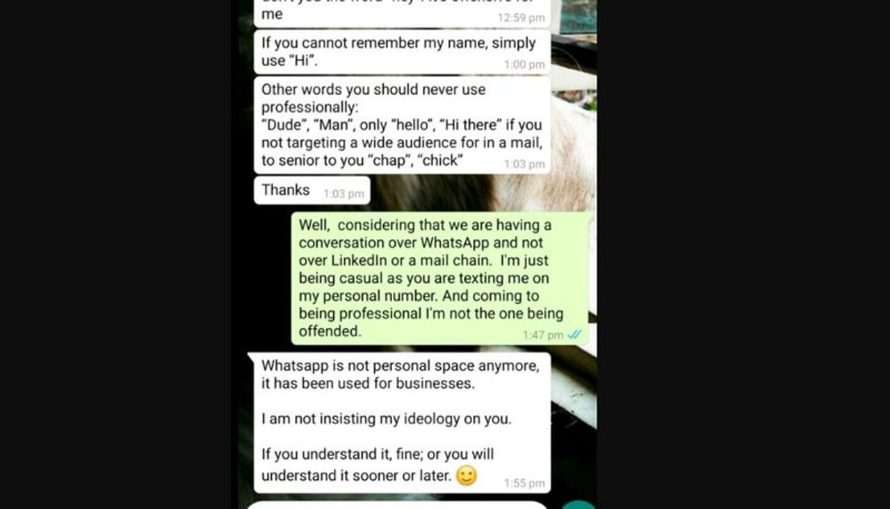 ಆದರೆ ಮೇಲಾಧಿಕಾರಿ ಹೀಗೆ ಹೇಳಿದಾಗ ಬಹುತೇಕರು ಕ್ಷಮೆ ಕೇಳುತ್ತಾರೆ. ಆದರೆ ಶ್ರೇಯಸ್ ಹಾಗೇ ಮಾಡಿಲ್ಲ. ಅದೇ ಕ್ಷಣಕ್ಕೆ ಅವರು ತನ್ನನ್ನು ತಾನು ಸಮರ್ಥಿಸಿಕೊಂಡಿದ್ದಾರೆ. ನಾವು ಪ್ರಸ್ತುತ ವಾಟ್ಸಾಪ್ನಲ್ಲಿ ಸಂಭಾಷಣೆ ನಡೆಸುತ್ತಿದ್ದೇವೆ. ಲಿಂಕ್ಡ್ಇನ್ ಅಥವಾ ಮೇಲ್ ಮೂಲಕ ಅಲ್ಲ ಎಂದು ಅವರು ಉತ್ತರಿಸಿದರು. ನೀವು ನನ್ನ ವೈಯಕ್ತಿಕ ಸಂಖ್ಯೆಗೆ ಸಂದೇಶ ಕಳುಹಿಸುತ್ತಿರುವುದರಿಂದ ನಾನು ಸಾಂದರ್ಭಿಕವಾಗಿ ವರ್ತಿಸುತ್ತಿದ್ದೇನೆ ಎಂದು ಹೇಳಿದ್ದಾರೆ.