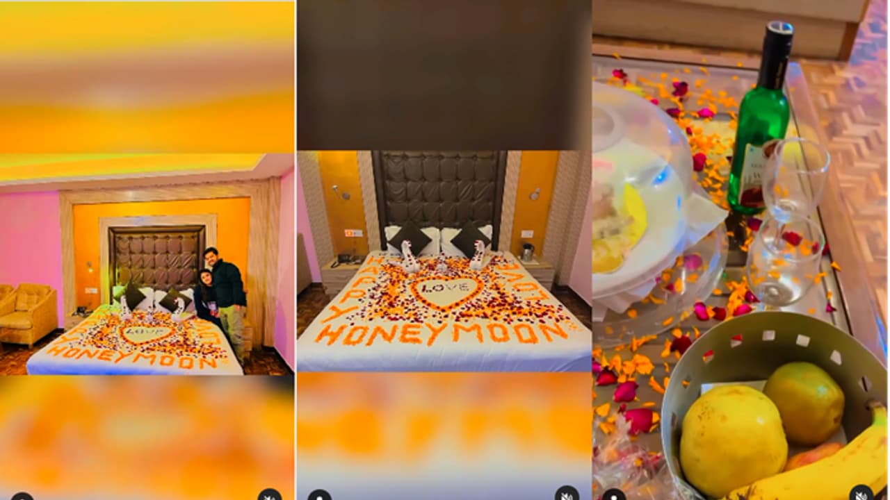 ಮದುವೆಯಾದ ನವ ಜೋಡಿಯ ರೋಮ್ಯಾಂಟಿಕ್ ಹನಿಮೂನ್ ವಿಡಿಯೋ ಒಂದು ವೈರಲ್ ಆಗಿದೆ. ಕ್ಯಾಂಡಲ್ಲೈಟ್ ಡಿನ್ನರ್, ಶಾಂಪೇನ್, ಕೇಕ್, ಸಿಂಗರಿಸಿದ ಬೆಡ್ ಸೇರಿದಂತೆ ಕೆಲ ಪ್ರಮುಖ ವಿಚಾರಗಳು ಈ ವಿಡಿಯೋದಲ್ಲಿದೆ.