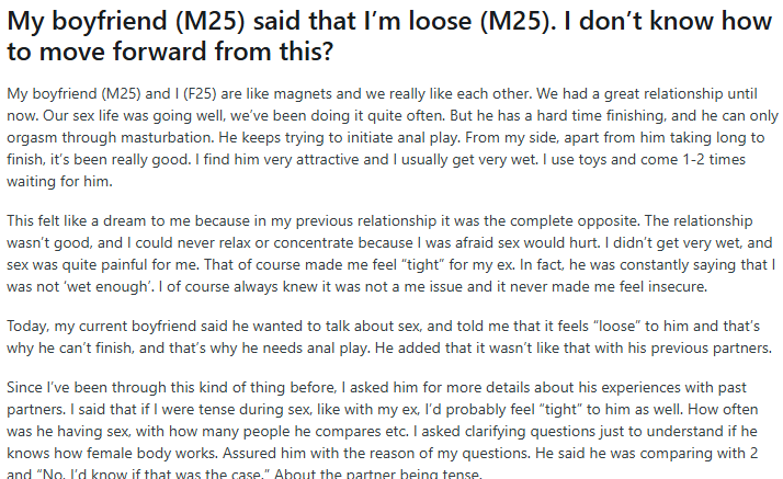 ಯುವತಿಯೇ ಹೇಳಿಕೊಂಡಿರುವಂತೆ "ನನ್ನ ಗೆಳೆಯ (25) ಮತ್ತು ನಾನು (25) ಆಯಸ್ಕಾಂತದಂತೆ ಇದ್ದೇವೆ. ಒಬ್ಬರನ್ನೊಬ್ಬರು ನಿಜವಾಗಿಯೂ ಇಷ್ಟಪಡುತ್ತಿದ್ದೇವೆ. ಇಲ್ಲಿಯವರೆಗೆ ನಮ್ಮ ಸಂಬಂಧ ಚೆನ್ನಾಗಿತ್ತು. ಲೈಂಗಿಕ ಜೀವನ ಕೂಡ ಚೆನ್ನಾಗಿ ನಡೆಯುತ್ತಿತ್ತು. ಹಾಗಾಗಿ ನಾವು ಅದನ್ನು ಆಗಾಗ್ಗೆ ಮಾಡುತ್ತಿದ್ದೆವು. ಆದರೆ ಅದು ಅವನಿಗೆ ಮುಗಿಸಲು ಕಷ್ಟವಾಗುತ್ತದೆ. ಹಸ್ತಮೈಥುನದ ಮೂಲಕ ಮಾತ್ರ ಪರಾಕಾಷ್ಠೆಯನ್ನು ಪಡೆಯುತ್ತಾನೆ. ಗುದದ ಆಟವನ್ನು ಪ್ರಾರಂಭಿಸಲು ಪ್ರಯತ್ನಿಸುತ್ತಲೇ ಇರುತ್ತಾನೆ. ಅವನು ಮುಗಿಸಲು ಹೆಚ್ಚು ಸಮಯ ತೆಗೆದುಕೊಳ್ಳುವುದನ್ನು ಹೊರತುಪಡಿಸಿದರೆ