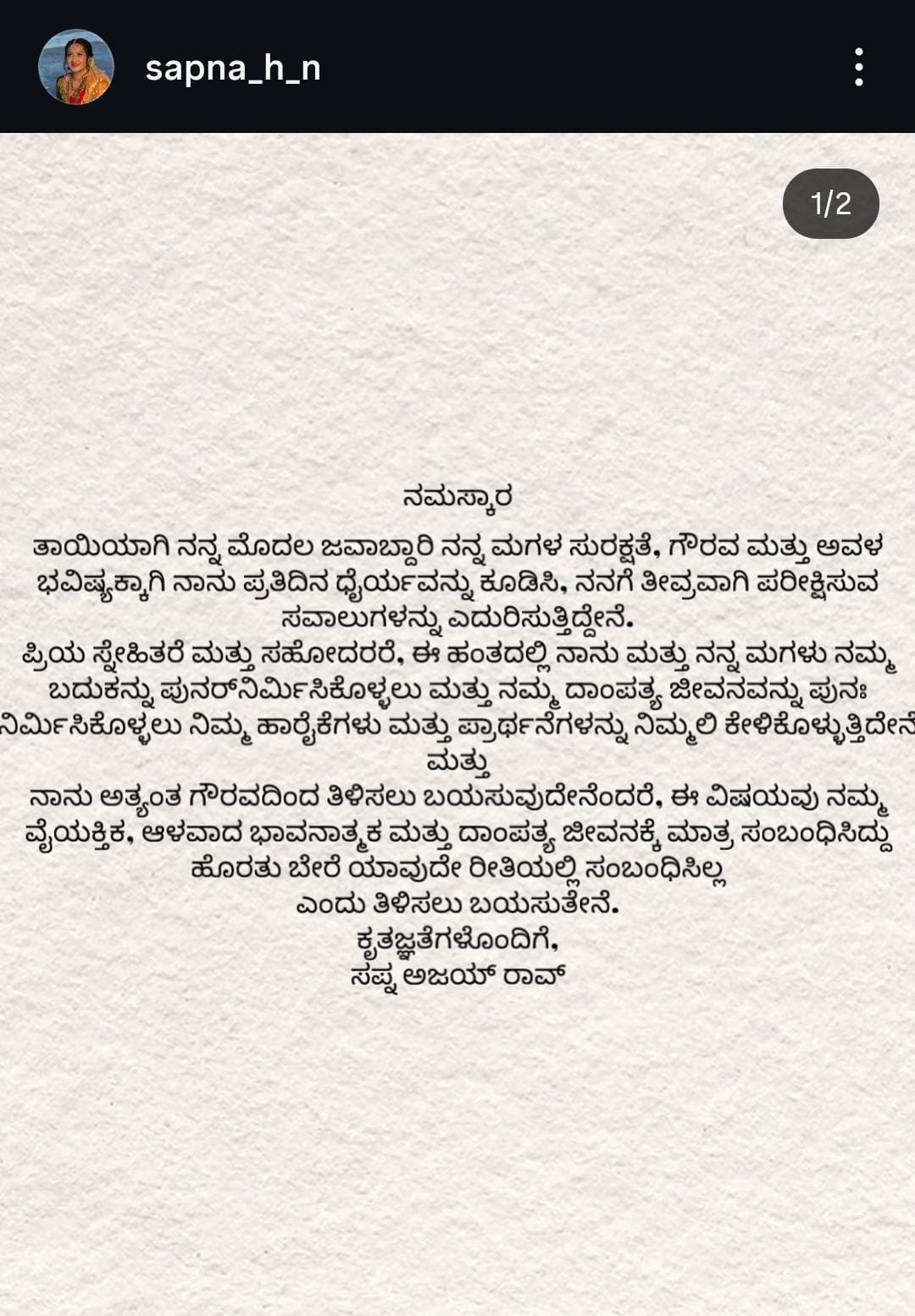 ಇನ್ನು ಇನ್ಸ್ಟಾಗ್ರಾಮ್ನಲ್ಲಿ ಸಪ್ನಾ ಅಜಯ್ ರಾವ್ ಎಂದು ಹೆಸರಿತ್ತು. ಅದನ್ನು ಅವರು ಸಪ್ನಾ ಎಚ್ ಎನ್ ಎಂದು ಬದಲಾಯಿಸಿಕೊಂಡಿದ್ದಾರೆ. ಇವರಿಬ್ಬರೂ ಪರಸ್ಪರ ಇನ್ಸ್ಟಾಗ್ರಾಮ್ನಲ್ಲಿ ಅನ್ಫಾಲೋ ಮಾಡಿದ್ದಾರೆ. ಸಪ್ನಾ ಅವರು ಗಂಡನ ಜೊತೆಗಿರುವ ಸಾಕಷ್ಟು ಫೋಟೋಗಳನ್ನು ಡಿಲಿಟ್ ಕೂಡ ಮಾಡಿದ್ದರು. ಅಷ್ಟೇ ಅಲ್ಲದೆ ಕೆಲ ತಿಂಗಳುಗಳ ಹಿಂದೆ ಈ ಜೋಡಿ ನಿರೂಪಕಿ ಅನುಶ್ರೀ ಯುಟ್ಯೂಬ್ ಚಾನೆಲ್ಗೆ ಜೋಡಿ ಸಂದರ್ಶನ ನೀಡಿತ್ತು. ಆ ವಿಡಿಯೋ ಕೂಡ ಡಿಲಿಟ್ ಆಗಿದೆ.