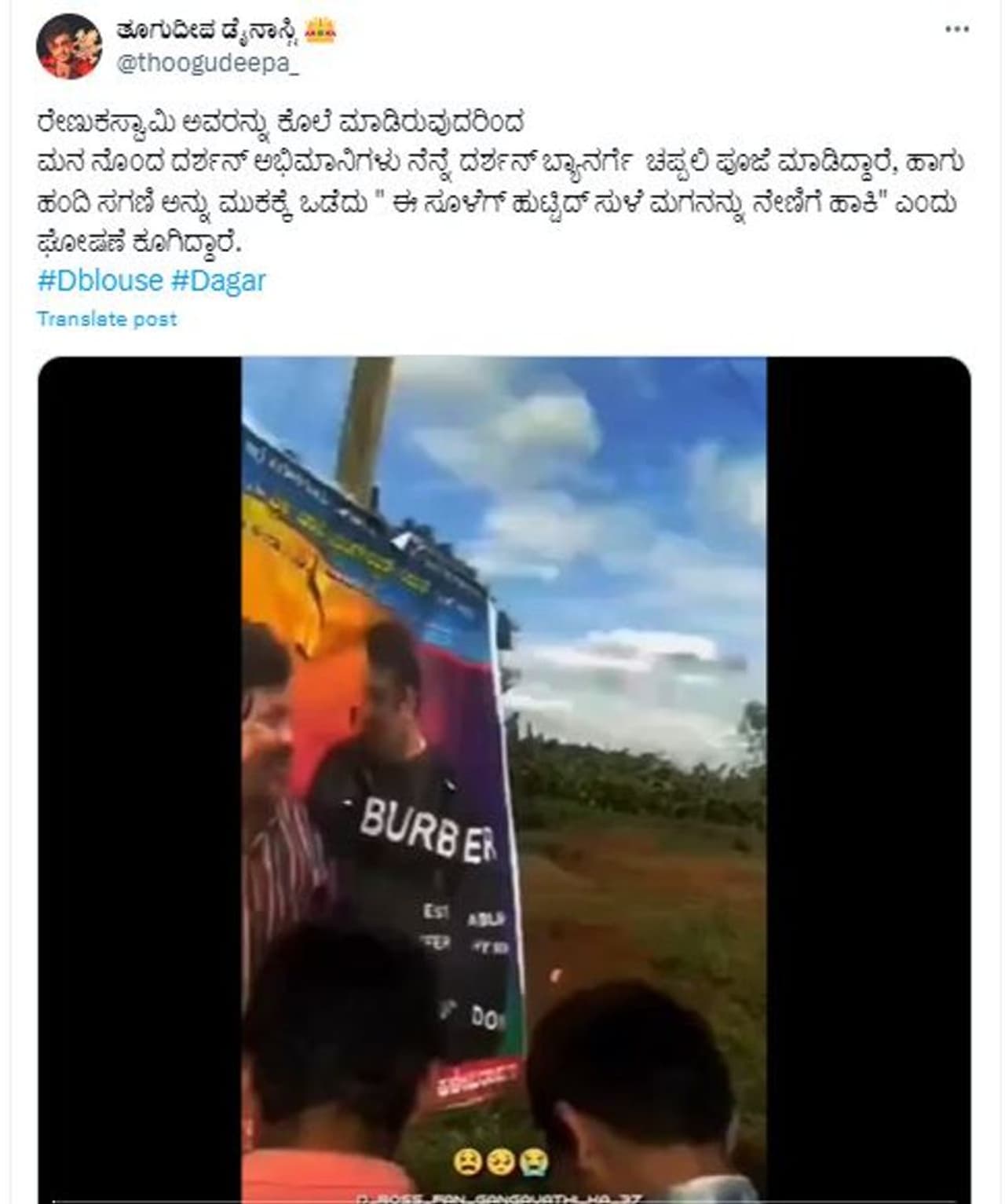ಈ ಸಾಮಾಜಿಕ ಜಾಲತಾಣದಲ್ಲಿ ವೈರಲ್ ಆಗುತ್ತಿರುವ ವಿಡಿಯೋದಲ್ಲಿ ದರ್ಶನ್ ಬ್ಯಾನರ್ಗೆ ಚಪ್ಪಲಿ ಪೂಜೆ ಮಾಡಿದ್ದಾರೆ ಹಾಗೂ ಹಂದಿ ಸಗಣಿ ಎಸೆದಿದ್ದಾರೆ. ತೂಗುದೀಪ ಡೈನಾಸ್ಟಿ ಎನ್ನು ಟ್ವಿಟರ್ ಖಾತೆಯಲ್ಲಿ ಈ ವಿಡಿಯೋ ಅಪ್ಲೋಡ್ ಆಗಿದ್ದು. 'ರೇಣುಕಸ್ವಾಮಿ ಅವರನ್ನು ಕೊಲೆ ಮಾಡಿರುವುದರಿಂದ ಮನ ನೊಂದ ದರ್ಶನ್ ಅಭಿಮಾನಿಗಳು ನೆನ್ನೆ ದರ್ಶನ್ ಬ್ಯಾನರ್ಗೆ ಚಪ್ಪಲಿ ಪೂಜೆ ಮಾಡಿದ್ದಾರೆ, ಹಾಗು ಹಂದಿ ಸಗಣಿ ಅನ್ನು ಮುಕಕ್ಕೆ ಒಡೆದು 'ಈ ಸೂಳೆಗ್ ಹುಟ್ಟಿದ್ ಸುಳೆ ಮಗನನ್ನು ನೇಣಿಗೆ ಹಾಕಿ' ಎಂದು ಘೋಷಣೆ ಕೂಗಿದ್ದಾರೆ' ಎಂದು ಬರೆದುಕೊಂಡಿದ್ದಾರೆ.