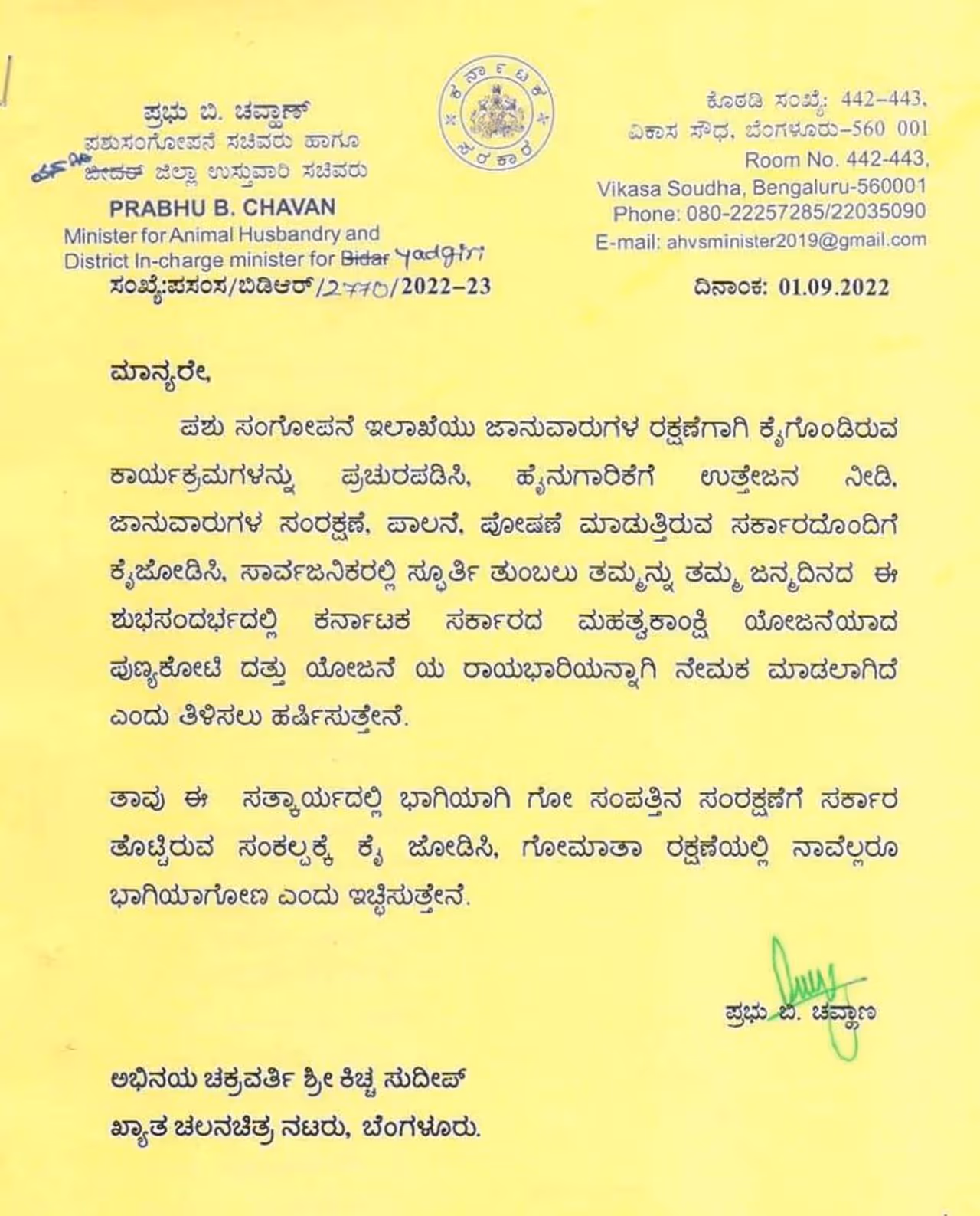 ಈ ಹಿಂದೆ ಪಶುಸಂಗೋಪನೆ ಸಚಿವ ಪ್ರಭು ಚವ್ಹಾಣ್ ಅವರು ನಟ ಸುದೀಪ್ ಅವರಿಗೆ ಪತ್ರ ಬರೆದು, ಪುಣ್ಯಕೋಟಿ ರಾಯಭಾರಿಯಾಗುವಂತೆ ಕೋರಿದ್ದರು. ಈ ಹಿನ್ನೆಲೆಯಲ್ಲಿ ನಟ ಸುದೀಪ್ ಪಶು ಸಂಗೋಪನೆ ಇಲಾಖೆಯ ರಾಯಭಾರಿ ಕೆಲಸ ನಿರ್ವಹಿಸಲು ಒಪ್ಪಿಕೊಂಡಿದ್ದಾರೆ. ಇಂದು ಅವರ ಜನ್ಮದಿನದ ಅಂಗವಾಗಿ ಪುಣ್ಯಕೋಟಿ ರಾಯಭಾರಿಯಾಗಿ ನೇಮಕ ಮಾಡಿರುವ ಕುರಿತು ಅಧಿಕೃತವಾಗಿ ಪತ್ರ ಬರೆಯಲಾಗಿದೆ. ಸುದೀಪ್ ಈ ಕೆಲಸಕ್ಕ ಯಾವುದೇ ಸಂಭಾವನೆ ಪಡೆಯದೇ ಗೋಸಂಪತ್ತಿನ ಸಂರಕ್ಷಣೆಗೆ ತಮ್ಮ ಸಣ್ಣದೊಂದು ಅಳಿಲು ಸೇವೆ ಸಲ್ಲಿಸುವುದಾಗಿ ತಿಳಿಸಿರುವುದಾಗಿ ಪ್ರಭು ಚವ್ಹಾಣ್ ವಿವರಿಸಿ, ಜನ್ಮದಿನಕ್ಕೆ ಶುಭ ಕೋರಿದ್ದಾರೆ.