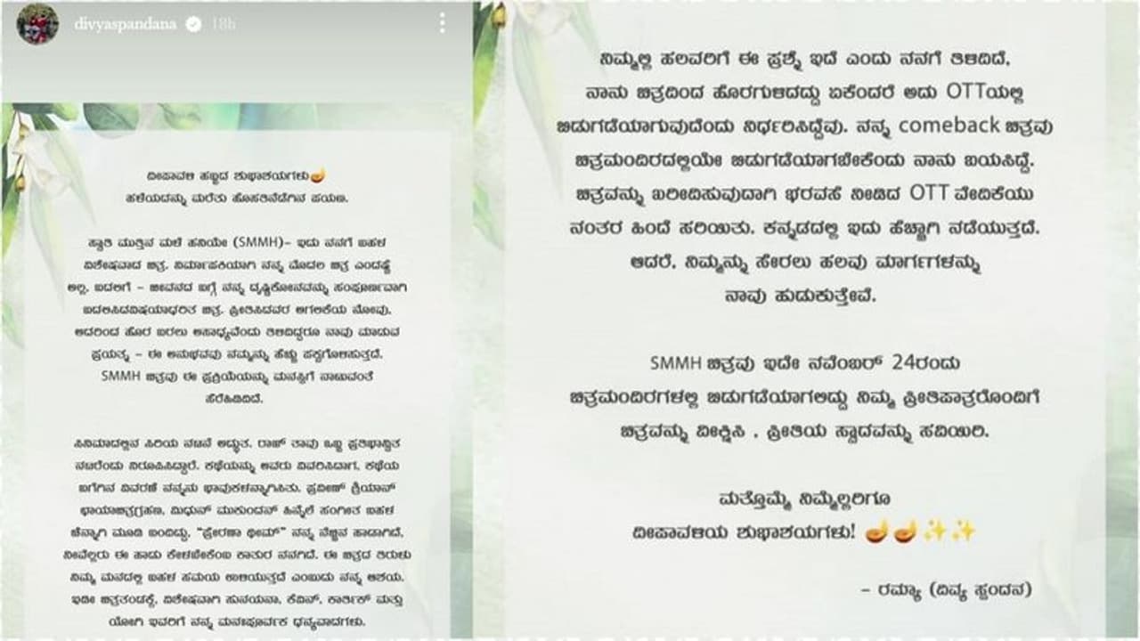 ಈ ಅನುಭವವು ನಮ್ಮನ್ನು ಹೆಚ್ಚು ಪಕ್ಷಗೊಳಿಸುತ್ತದೆ. 'ಸ್ವಾತಿ ಮುತ್ತಿನ ಮಳೆ ಹನಿಯೇ' ಚಿತ್ರವು ಈ ಪ್ರಕ್ರಿಯೆಯನ್ನು ಮನಸ್ಸಿಗೆ ನಾಟುವಂತೆ ಸೆರೆಹಿಡಿದಿದೆ" ಎಂದು ರಮ್ಯಾ ಬರೆದುಕೊಂಡಿದ್ದಾರೆ. 'ನಿಮ್ಮಲ್ಲಿ ಹಲವರಿಗೆ ಈ ಪ್ರಶ್ನೆ ಇದೆ ಎಂದು ನನಗೆ ತಿಳಿದಿದೆ. ನಾನು ಚಿತ್ರದಿಂದ ಹೊರಗುಳಿದದ್ದು ಏಕೆಂದರೆ, ಅದು ಓಟಿಟಿಯಲ್ಲಿ ಬಿಡುಗಡೆಯಾಗುವುದೆಂದು ನಿರ್ಧರಿಸಿದ್ದೆವು. ನನ್ನ ಕಮ್ಬ್ಯಾಕ್ ಚಿತ್ರವು ಚಿತ್ರಮಂದಿರದಲ್ಲಿಯೇ ಬಿಡುಗಡೆ ಆಗಬೇಕೆಂದು ನಾನು ಬಯಸಿದ್ದೆ. ಚಿತ್ರವನ್ನು ಖರೀದಿಸುವುದಾಗಿ ಭರವಸೆ ನೀಡಿದ ಓಟಿಟಿ ವೇದಿಕೆಯು ನಂತರ ಹಿಂದೆ ಸರಿಯಿತು. ಕನ್ನಡದಲ್ಲಿ ಇದು ಹೆಚ್ಚಾಗಿ ನಡೆಯುತ್ತದೆ' ಎಂದು ರಮ್ಯಾ ಹೇಳಿದ್ದಾರೆ.