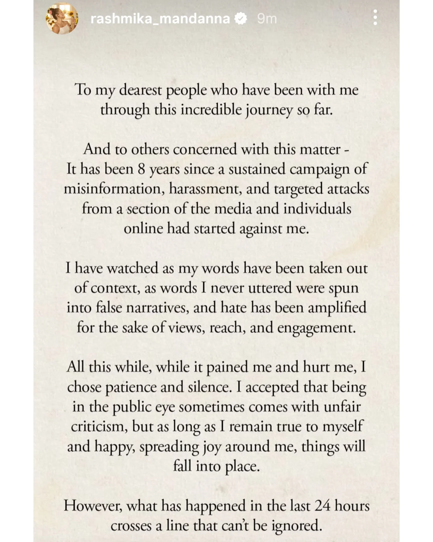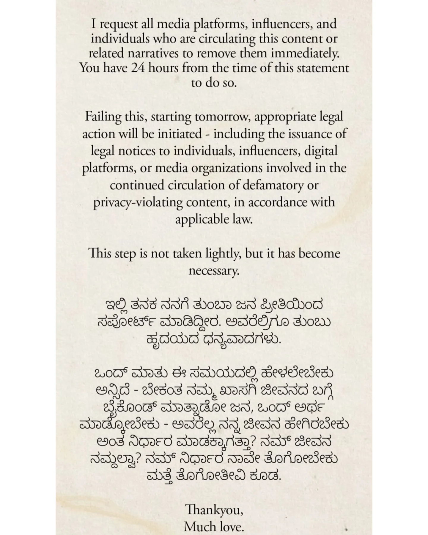 ನನ್ನ ಸಿನಿಮಾ ರಂಗದ ಈ ಅದ್ಭುತ ಪಯಣದಲ್ಲಿ ಇಲ್ಲಿಯವರೆಗೆ ನನ್ನ ಜೊತೆಗಿರುವ ನನ್ನ ಪ್ರೀತಿಯ ಜನರಿಗೆ, ಇದಕ್ಕೆ ಸಂಬಂಧಪಟ್ಟ ಉಳಿದವರಿಗೂ ನಮಸ್ಕಾರಗಳು. ಕಳೆದ 8 ವರ್ಷಗಳಿಂದ ಮಾಧ್ಯಮದ ಒಂದು ವರ್ಗ, ಕೆಲವು ವ್ಯಕ್ತಿಗಳಿಂದ ನನ್ನ ವಿರುದ್ಧ ಸುಳ್ಳು ಮಾಹಿತಿ, ಕಿರುಕುಳ ಆಗುತ್ತಿದೆ, ದಾಳಿ ಮಾಡುತ್ತಿದ್ದಾರೆ.
