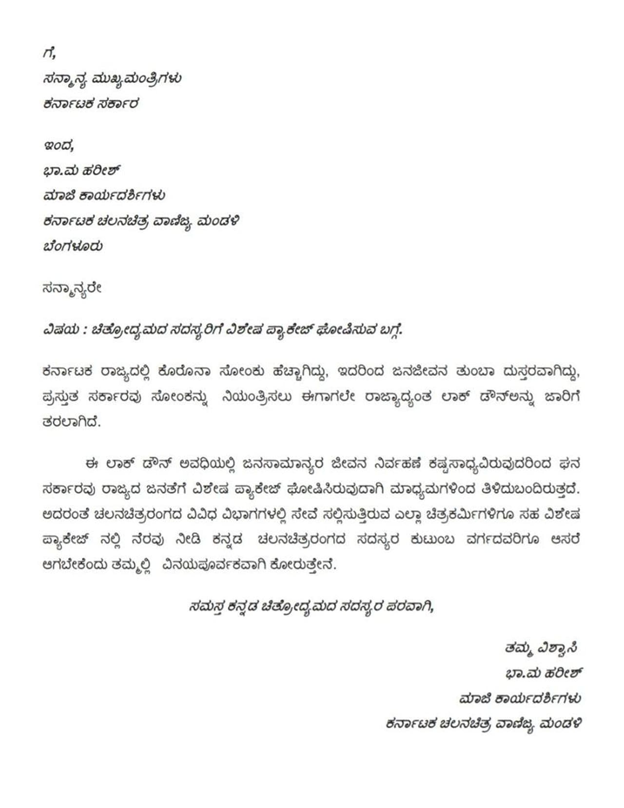 ಕರ್ನಾಟಕ ಚಲನಚಿತ್ರ ವಾಣಿಜ್ಯ ಮಂಡಳಿ ಕಾರ್ಯಕಾರಿ ಸಮಿತಿ ಸದಸ್ಯರಾದ ಭಾ.ಮಾ ಹರೀಶ್ ಮಾನ್ಯ ಮುಖ್ಯಮಂತ್ರಿ ಅವರಿಗೆ ಪತ್ರ ಬರೆಯುವ ಮೂಲಕ ಚಿತ್ರೋದ್ಯಮ ಸದಸ್ಯರಿಗೆ ವಿಶೇಷ ಪ್ಯಾಕೇಜ್ ಹಾಗೂ ಕೋವಿಡ್ ಕೇಂದ್ರಗಳನ್ನು ಆರಂಭಿಸುವ ಬಗ್ಗೆ ಮನವಿ ಮಾಡಿಕೊಂಡಿದ್ದಾರೆ.