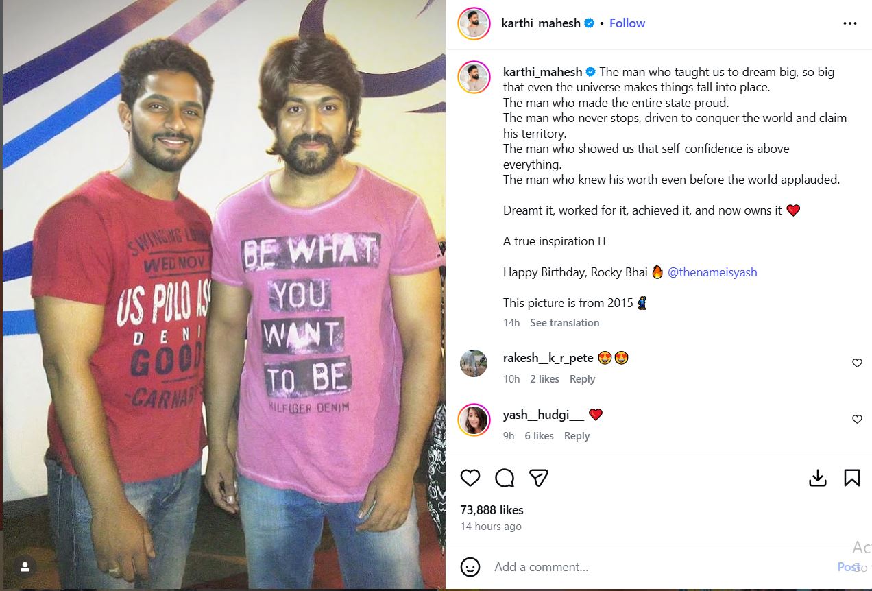 ಯಶ್ ಅವರ ಯಶಸ್ಸಿನ ಮಂತ್ರವನ್ನು ಕಾರ್ತಿಕ್ ಮಹೇಶ್ ಮಾರ್ಮಿಕವಾಗಿ ಹೀಗೆ ಹೇಳಿದ್ದಾರೆ: "ಯಾವುದನ್ನು ಅವರು ಕನಸು ಕಂಡರೋ, ಅದಕ್ಕಾಗಿ ಅಹೋರಾತ್ರಿ ಶ್ರಮಿಸಿದರು. ಇಂದು ಆ ಯಶಸ್ಸನ್ನು ಸಾಧಿಸಿ, ಆ ಸಾಮ್ರಾಜ್ಯಕ್ಕೆ ಒಡೆಯರಾಗಿದ್ದಾರೆ. ಇವರು ನಿಜವಾದ ಸ್ಫೂರ್ತಿ. ಹುಟ್ಟುಹಬ್ಬದ ಶುಭಾಶಯಗಳು ರಾಕಿ ಭಾಯ್" ಎಂದು ಗೌರವ ಪೂರ್ವಕವಾಗಿ ಹಾರೈಸಿದ್ದಾರೆ. ಜೊತೆಗೆ, 2015ರಲ್ಲಿ ತಾವು ಯಶ್ ಅವರ ಜೊತೆಯಲ್ಲಿ ನಿಂತು ತೆಗೆಸಿಕೊಂಡಿರುವ ಫೊಟೋವೊಂದನ್ನು ಪೋಸ್ಟ್ ಮಾಡಿದ್ದಾರೆ.