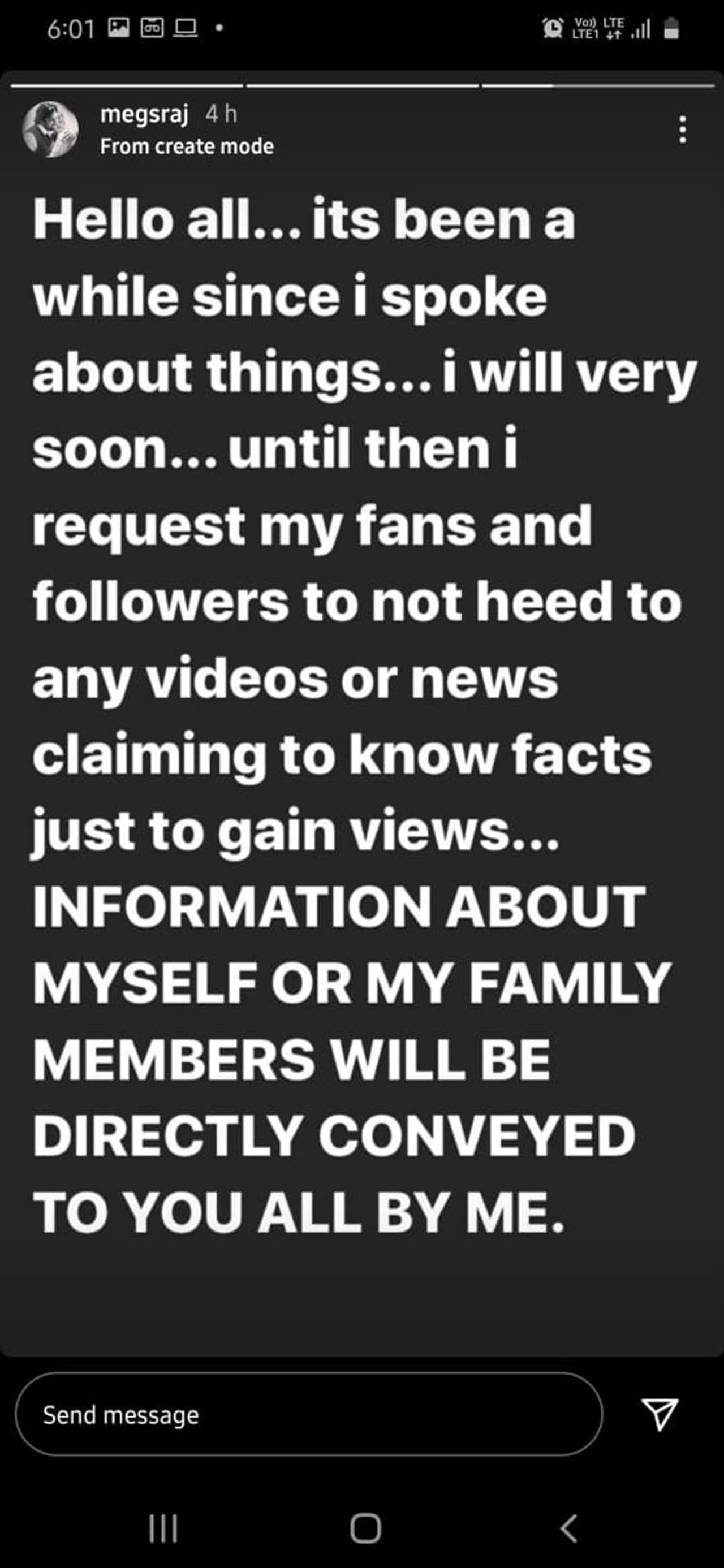 ನನ್ನ ಬಗ್ಗೆ ಯಾವುದೇ ಸುದ್ದಿ ಹೊರಬರಬೇಕಾದರೂ ಕುಟುಂಬದ ಮೂಲದಿಂದ ಬರುತ್ತದೆ. ದಯವಿಟ್ಟು ಇಂಥ ವಿಡಿಯೋಗಳನ್ನು ನೋಡಬೇಡಿ ಎಂದು ಅಭಿಮಾನಿಗಳಲ್ಲಿ ಮನವಿ ಮಾಡಿಕೊಂಡಿದ್ದಾರೆ.
