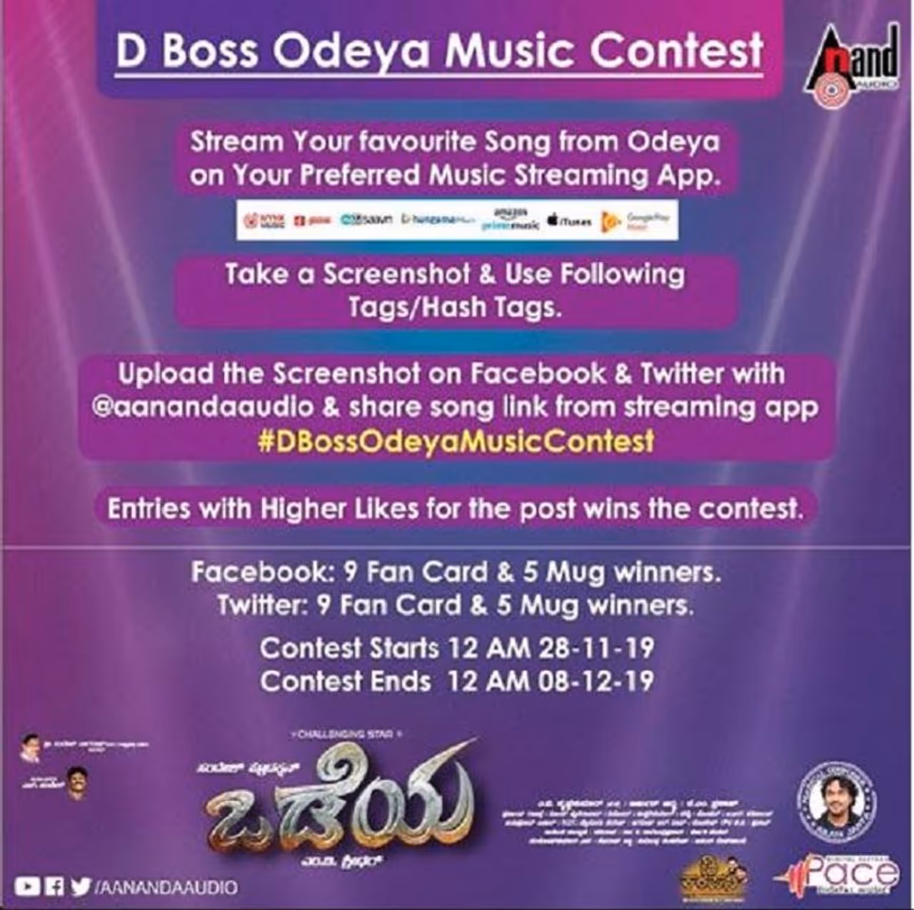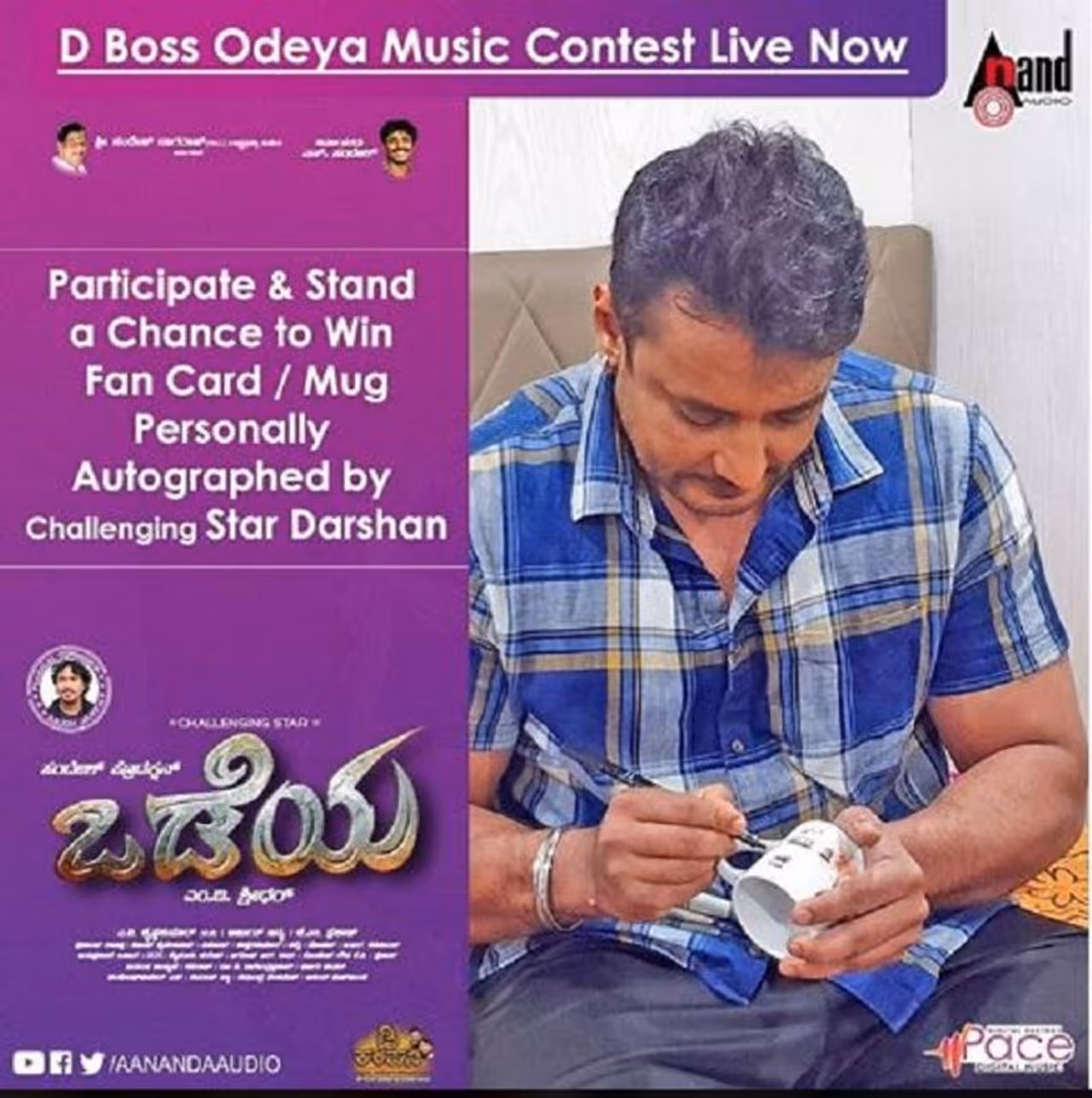 'ಒಡೆಯ' ನನ್ನು ಸ್ವಾಗತಿಸಲು ಅಭಿಮಾನಿಗಳು ಕಾತರದಿಂದ ಕಾಯುತ್ತಿದ್ದಾರೆ. ಚಿತ್ರಕ್ಕೆ ಇನ್ನಷ್ಟು ಹೈಪ್ ಕೊಡಲು ಚಿತ್ರತಂಡ ಪ್ರಮೋಶನ್ನಲ್ಲಿ ಬ್ಯುಸಿಯಾಗಿದೆ. ಈಗಾಗಲೇ ಬೇರೆ ಬೇರೆ ರೀತಿಯ ಪ್ರಮೋಶನ್ ಗಿಮಿಕ್ ಮಾಡಿದೆ. 'ಒಡೆಯ' ಸಿನಿಮಾದ ಫೇವರೇಟ್ ಹಾಡನ್ನು ಮ್ಯೂಸಿಕ್ App ಲಿ ಕೇಳಿ ಅದರ ಸ್ಕ್ರೀನ್ ಶಾಟ್ ಹೊಡೆದು ಹ್ಯಾಶ್ ಟ್ಯಾಗ್ ಜೊತೆ ಫೇಸ್ಬುಕ್, ಟ್ವಿಟರ್ನಲ್ಲಿ ಶೇರ್ ಮಾಡಿಕೊಳ್ಳಬೇಕು. ಅತೀ ಹೆಚ್ಚು ಲೈಕ್ ಪಡೆದವರಿಗೆ ದಚ್ಚು ಸಹಿ ಮಾಡಿರುವ ಮಗ್ನ್ನು ಗಿಫ್ಟ್ ಆಗಿ ಸಿಗಲಿದೆ ಎಂದು ಹೇಳಿತ್ತು.