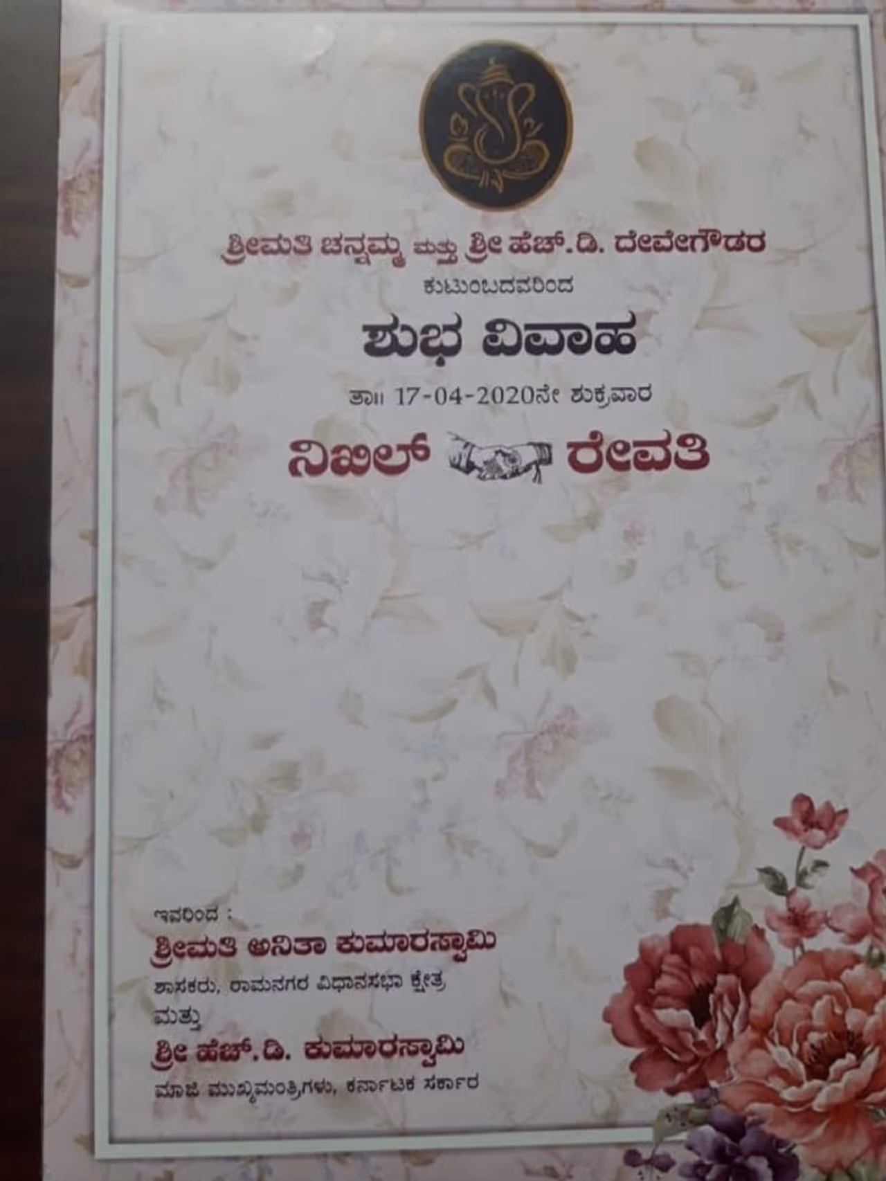 ಏಪ್ರಿಲ್ 17ರಂದು ದಾಂಪತ್ಯ ಜೀವನಕ್ಕೆ ಕಾಲಿಡುತ್ತಿರುವ ಮಾಜಿ ಸಿಎಂ ಎಚ್.ಡಿ.ಕುಮಾರಸ್ವಾಮಿ ಪುತ್ರ ನಿಖಿಲ್ ಮತ್ತು ರೇವತಿ ಮದುವೆ ಆಮಂತ್ರಣ ಪತ್ರಿಕೆಯನ್ನು ರಾಮನಗರದ ಜನತೆಗೆ ಹಂಚುತ್ತಿದ್ದಾರೆ, ಆದರೆ, ಇದು ಫೇಕ್ ಎಂಬುವುದೀಗ ಬಹಿರಂಗವಾಗಿದೆ.