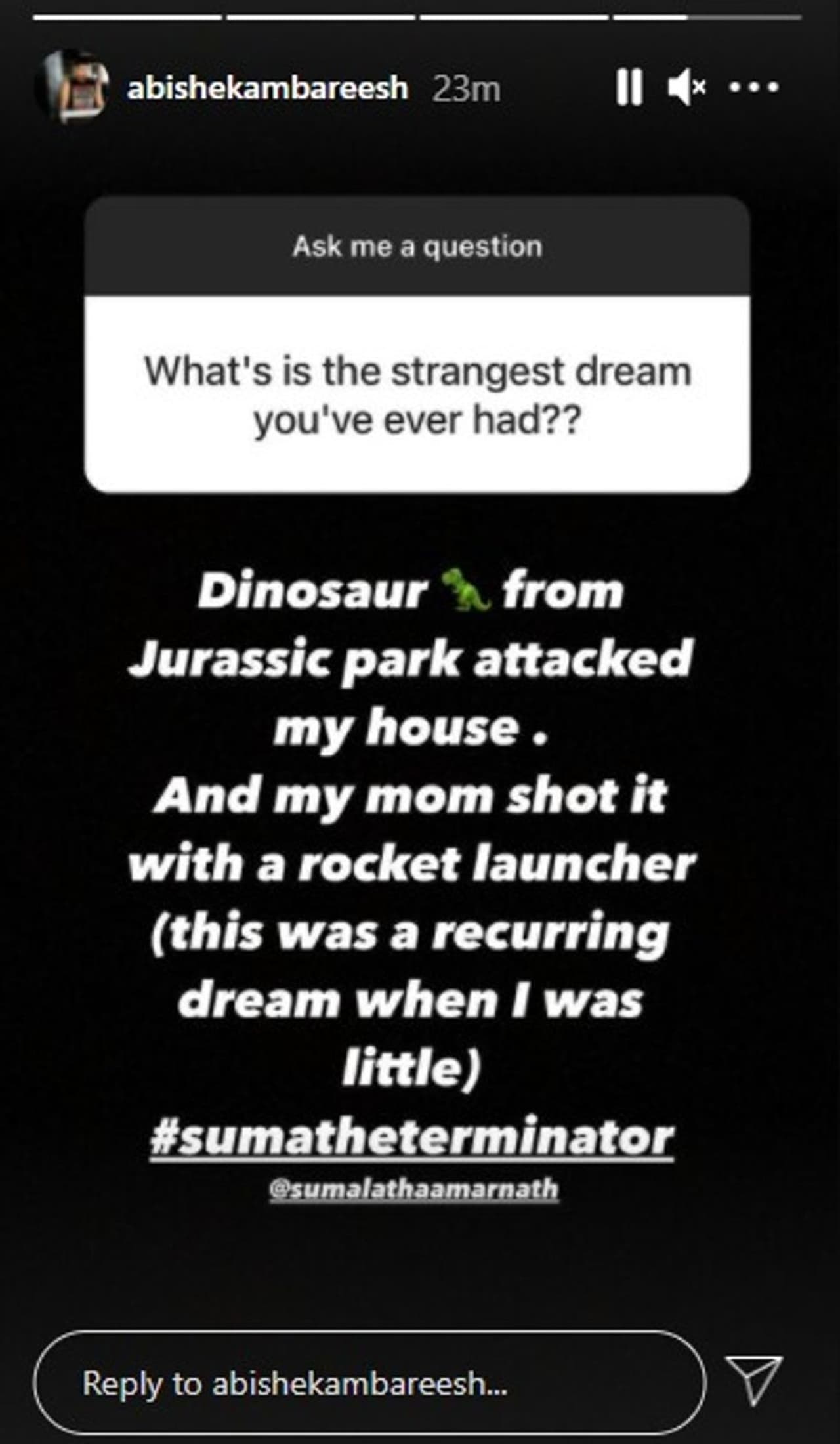 'ಈ ವರೆಗೂ ನಿಮಗೆ ಬಿದ್ದ ವಿಚಿತ್ರ ಕನಸು ಯಾವುದು' ಎಂದು ಒಬ್ಬ ಅಭಿಮಾನಿ ಪ್ರಶ್ನೆ ಮಾಡಿದ್ದಾನೆ. 'ಜುರಾಸಿಕ್ ಪಾರ್ಕ್ನಿಂದ ಡೈನೋಸಾರ್ ಬಂದು ನಮ್ಮ ಮನೆಯನ್ನು ಅಟ್ಯಾಕ್ ಮಾಡಿತ್ತು. ನನ್ನ ತಾಯಿ ರಾಕೆಟ್ ಲಾಂಚರ್ ಬಳಸಿ ಅದನ್ನು ಶೂಟ್ ಮಾಡಿದ್ದರು. ನನ್ನ ಬಾಲ್ಯದಲ್ಲಿ ಈ ಕನಸು ನನಗೆ ಪದೇ ಪದೇ ಬೀಳುತ್ತಿತ್ತು. ಸುಮಾ ದಿ ಟರ್ಮಿನೇಟರ್' ಎಂದು ಅಭಿಷೇಕ್ ಉತ್ತರ ನೀಡಿದ್ದರು.