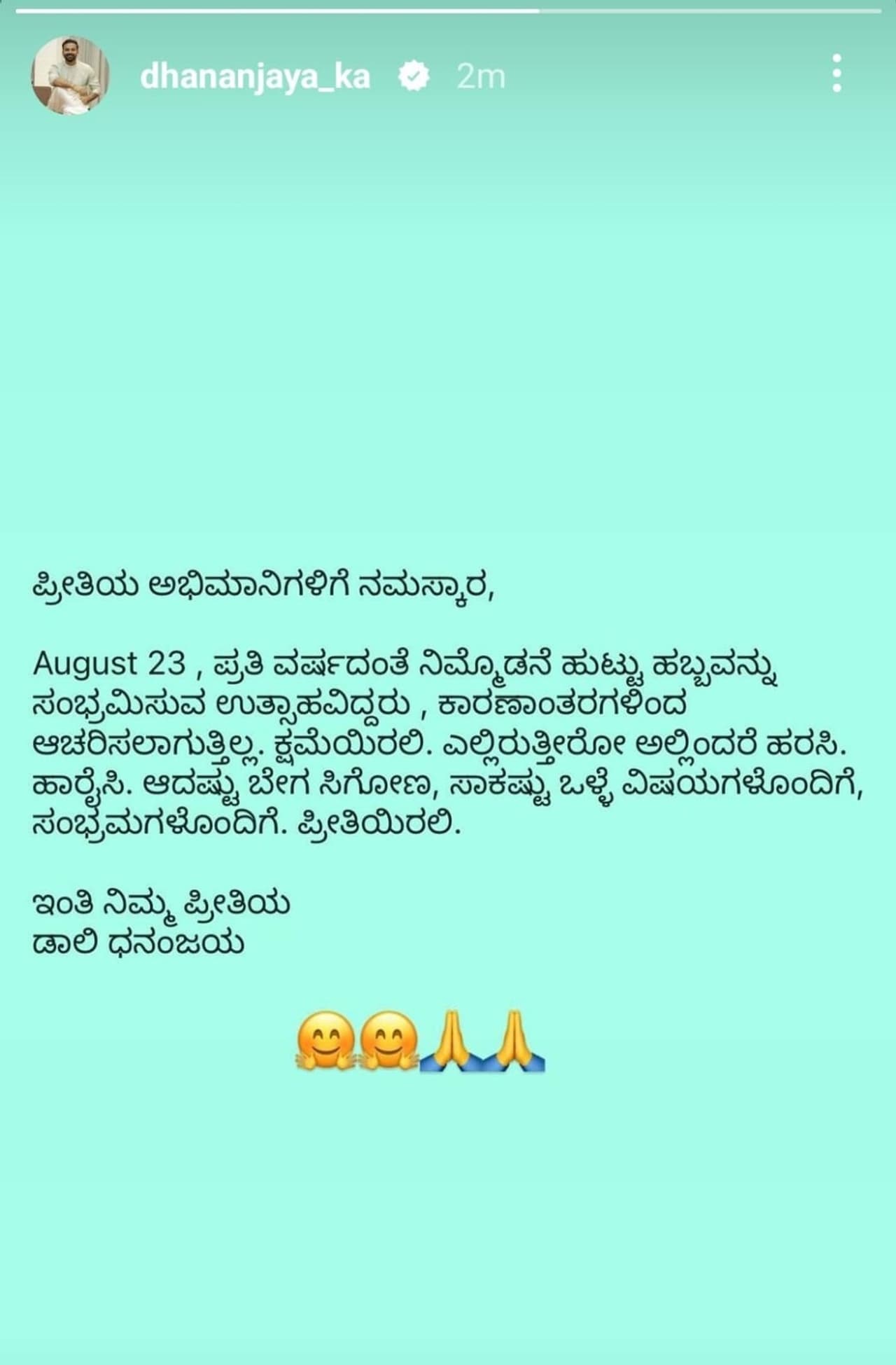 ಹಾಗಿದ್ದರೆ ನಟ ಡಾಲಿ ಧನಂಜಯ್ ಏನಂತ ಪತ್ರ ಬರೆದಿದ್ದಾರೆ. 'ಪ್ರೀತಿಯ ಅಭಿಮಾನಿಗಳಿಗೆ ನಮಸ್ಕಾರ. ಆಗಸ್ಟ್ 23, ಪ್ರತಿವರ್ಷದಂತೆ ನಿಮ್ಮೊಡನೆ ಹುಟ್ಟುಹಬ್ಬವನ್ನು ಸಂಭ್ರಮಿಸುವ ಉತ್ಸಾಹವಿದ್ದರೂ ಕಾರಣಾಂತರಗಳಿಂದ ಆಚರಿಸಲಾಗುತ್ತಿಲ್ಲ, ಕ್ಷಮೆಯಿರಲಿ. ಎಲ್ಲಿರುತ್ತೀರೋ ಅಲ್ಲಿಂದಲೇ ಹರಿಸಿ, ಹಾರೈಸಿ.. ಆದಷ್ಟು ಬೇಗ ಸಿಗೋಣ, ಸಾಕಷ್ಟು ಒಳ್ಳೆಯ ವಿಷಯಗಳೊಂದಿಗೆ, ಸಂಭ್ರಮಗಳೊಂದಿಗೆ. ಪ್ರೀತಿಯಿರಲಿ. ಇಂತಿ ನಿಮ್ಮ ಪ್ರೀತಿಯ, ಡಾಲಿ ಧನಂಜಯ್' ಎಂದು ಬರೆದುಕೊಂಡಿದ್ದಾರೆ.