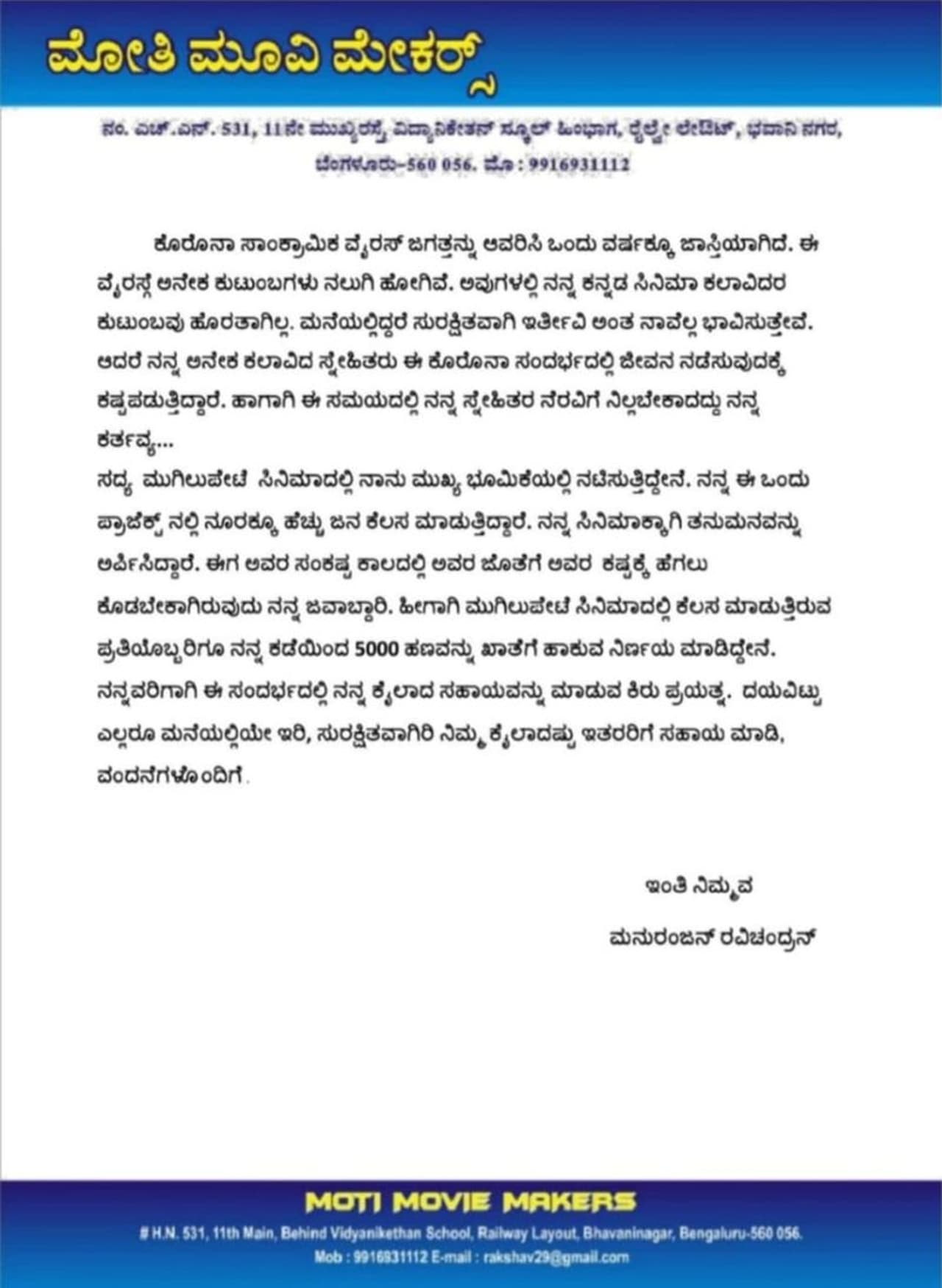'ಈ ವೈರಸ್ ಕಾರಣ ಅನೇಕ ಕುಟುಂಬಗಳು ನಲುಗಿ ಹೋಗಿವೆ. ಅವುಗಳಲ್ಲಿ ತಾವು ನಟಿಸಿರುವ ಕನ್ನಡ ಸಿನಿಮಾ ಕಲಾವಿದರ ಕುಟುಂಬಗಳೂ ಹೊರತಾಗಿಲ್ಲ. ಮನೆಯಲ್ಲಿದದ್ದರೆ ಸುರಕ್ಷಿತವಾಗಿ ಇರ್ತಿವಿ ಅಂತ ನಾವೆಲ್ಲ ಭಾವಿಸುತ್ತೇವೆ. ಆದರೆ ತಮ್ಮ ಅನೇಕ ಕಲಾವಿದ ಸ್ನೇಹಿತರು ಈ ಕೊರೋನಾ ಸಂದರ್ಭದಲ್ಲಿ ಜೀವನ ನಡೆಸುವುದಕ್ಕೆ ಕಷ್ಟ ಪಡುತ್ತಿದ್ದಾರೆ. ಹೀಗಾಗಿ ಈ ಸಮಯದಲ್ಲಿ ತಮ್ಮ ಸ್ನೇಹಿತರ ನೆರವಿಗೆ ನಿಲ್ಲಬೇಕಾಗಿದ್ದು ನನ್ನ ಕರ್ತವ್ಯ. ನನ್ನ ಮುಗಿಲುಪೇಟೆ ಸಿನಿಮಾದಲ್ಲಿ ನಾನು ಮುಖ್ಯ ಭೂಮಿಕೆಯಲ್ಲಿ ನಟಿಸುತ್ತಿದ್ದೇನೆ. ನನ್ನ ಈ ಒಂದು ಪ್ರೊಜೆಕ್ಟ್ನಲ್ಲಿ ನೂರಕ್ಕೂ ಹೆಚ್ಚಿನ ಜನರು ಕೆಲಸ ಮಾಡುತ್ತಿದ್ದಾರೆ. ನನ್ನ ಸಿನಿಮಾಗಾಗಿ ತನುಮನವನ್ನು ಅರ್ಪಿಸಿದ್ದಾರೆ. ಈಗ ಅವರ ಸಂಕಷ್ಟ ಕಾಲದಲ್ಲಿ ಅವರ ಜೊತೆಗೆ ಕಷ್ಟಕ್ಕೆ ಹೆಗಲು ಕೊಡಬೇಕಾಗಿರುವುದು ನನ್ನ ಬವಾಬ್ದಾರಿ. ಹೀಗಾಗಿ ಮುಗಿಲುಪೇಟೆ ಸಿನಿಮಾದಲ್ಲಿ ಕೆಲಸ ಮಾಡುತ್ತಿರುವ ಪ್ರತಿಯೊಬ್ಬರಿಗೂ ನನ್ನ ಕಡೆಯಿಂದ 5000 ರೂ. ಹಣವನ್ನು ಅವರವ ಖಾತೆಗೆ ಹಾಕುವ ನಿರ್ಣಯ ಮಾಡಿದ್ದೇನೆ. ನನ್ನವರಿಗಾಗಿ ಈ ಸಂದರ್ಭದಲ್ಲಿ ನನ್ನ ಕೈಲಾದ ಸಹಾಯವನ್ನು ಮಾಡುವ ಕಿರು ಪ್ರಯತ್ನ. ದಯವಿಟ್ಟು ಮನೆಯಲ್ಲಿಯೇ ಇರಿ, ಸುರಕ್ಷಿತವಾಗಿರಿ. ನಿಮ್ಮ ಕೈಲಾದಷ್ಟು ಇತರರಿಗೂ ಸಹಾಯ ಮಾಡಿ,' ಎಂದು ಮನೋರಂಜನ್ ಪತ್ರದಲ್ಲಿ ಬರೆದಿದ್ದಾರೆ.