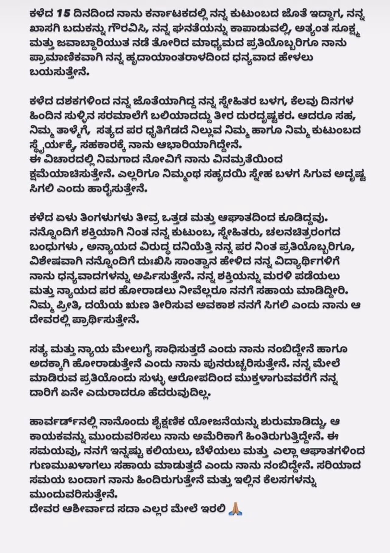 'ಕಳೆದ 15 ದಿನದಿಂದ ನಾನು ಕರ್ನಾಟಕದಲ್ಲಿ ನನ್ನ ಕುಟುಂಬದ ಜೊತೆ ಇದ್ದಾಗ, ನನ್ನ ಖಾಸಗಿ ಬದುಕನ್ನು ಗೌರವಿಸಿದ ನನ್ನ ಘನತೆಯನ್ನು ಕಾಪಾಡುವಲ್ಲಿ ಅತ್ಯಂತ ಸೂಕ್ಷ್ಮ ಮತ್ತು ಜವಾಬ್ದಾರಿಯುತ ನಡೆ ತೋರಿದ ಮಾಧ್ಯಮದ ಪ್ರತಿಯೊಬ್ಬರಿಗೂ ನಾನು ಪ್ರಾಮಾಣಿಕವಾಗಿ ನನ್ನ ಹೃದಾಯಾಂತರಾಳದಿಂದ ಧನ್ಯವಾದ ಹೇಳಲು ಬಯಸುತ್ತೇನೆ.