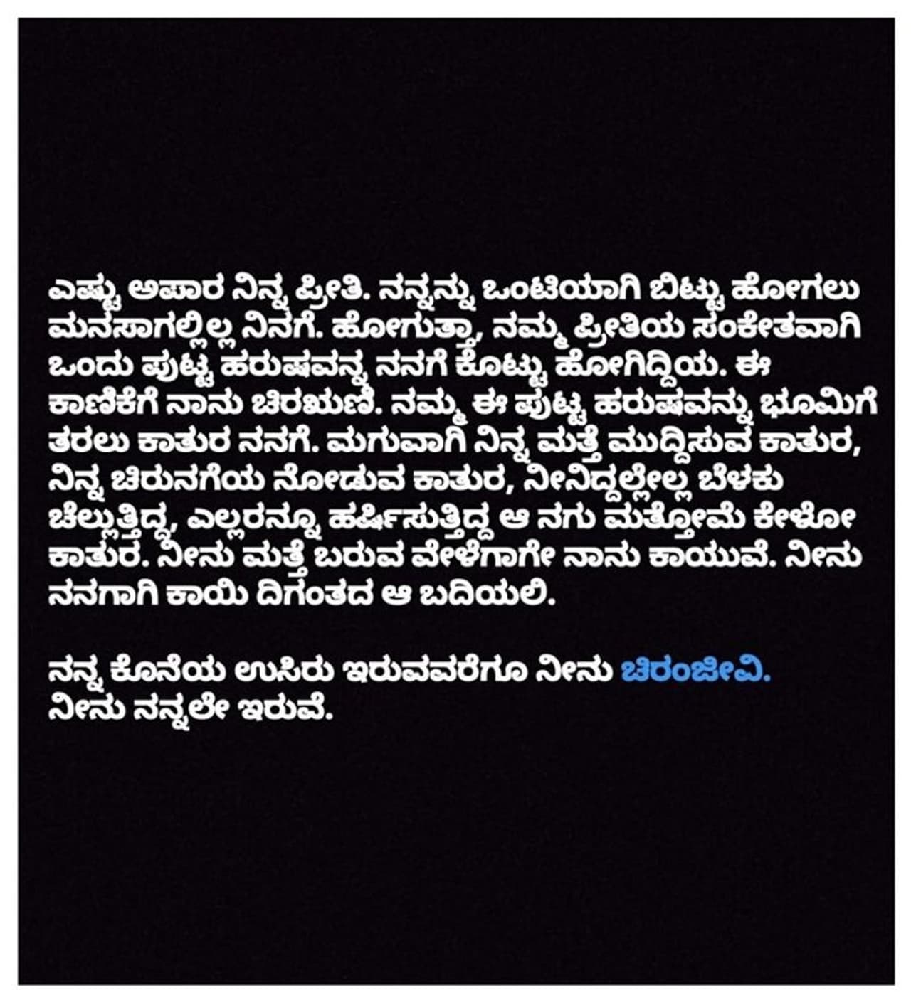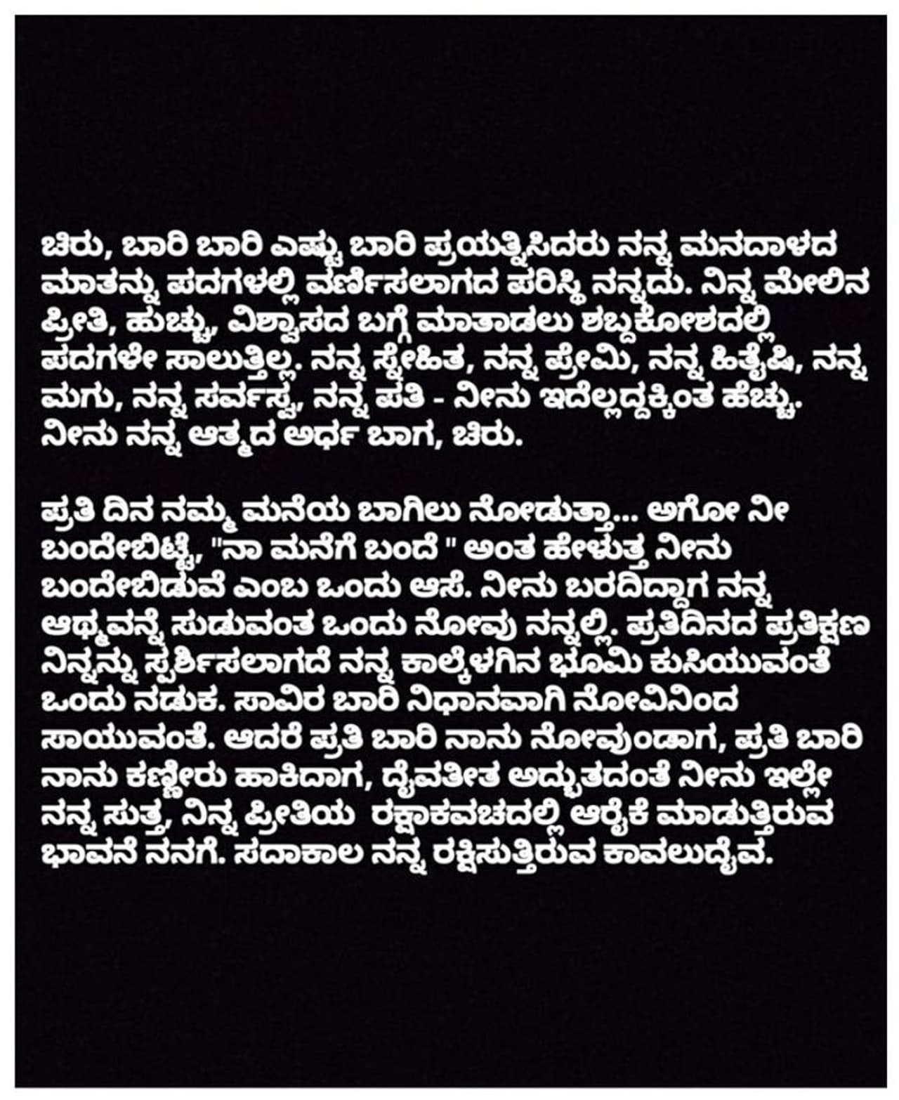 'ಚಿರು, ನಿನಗೆ ಏನೇನು ಹೇಳಬೇಕು ಅಂತ ಬಯಸಿದೆನೋ ಅದನ್ನೆಲ್ಲಾ ಅಕ್ಷರಗಳನ್ನು ಮೂಡಿಸಲು ತುಂಬಾ ಪ್ರಯತ್ನ ಪಟ್ಟು ಸೋತು ಹೋದೆ. ನೀನು ನನಗೆ ಏನು ಅನ್ನುವುದನ್ನು ವಿವರಿಸಲು ಯಾವ ಪದಗಳಿಗೂ ಶಕ್ತಿ ಇಲ್ಲ. ನೀನು ನನ್ನ ಗೆಳೆಯ, ನನ್ನ ಪ್ರೀತಿ, ನನ್ನ ಸಂಗಾತಿ, ನನ್ನ ಕಂದ, ನನ್ನ ವಿಶ್ವಾಸ, ನನ್ನ ಗಂಡ - ಇವೆಲ್ಲಕ್ಕಿಂತಲೂ ಹೆಚ್ಚು ನೀನು. ನೀನು ನನ್ನ ಆತ್ಮದ ಒಂದು ಭಾಗ ಚಿರು.