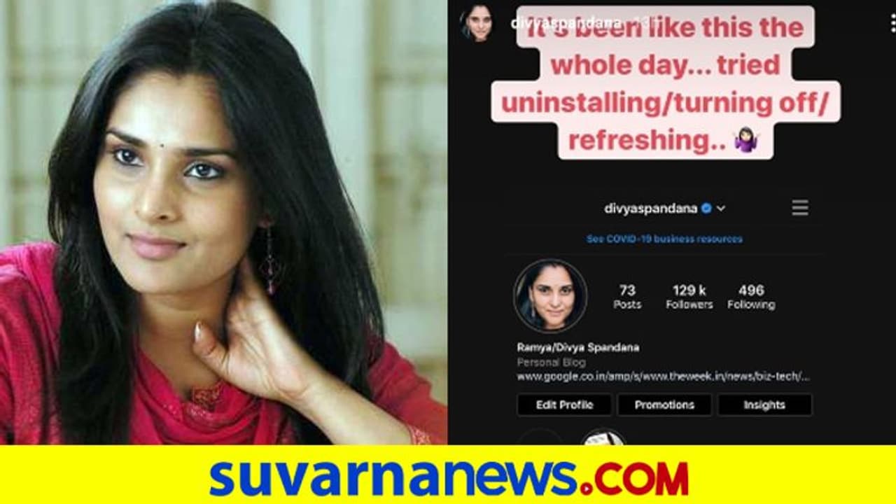 ಸ್ಯಾಂಡಲ್ವುಡ್ ಎವರ್ಗ್ರೀನ್ ಮೋಹಕತಾರೆ ನಟಿ ರಮ್ಯಾ ಕೆಲವು ತಿಂಗಳಿನಿಂದ ಸೋಷಿಯಲ್ ಮೀಡಿಯಾದಲ್ಲಿ ಆ್ಯಕ್ಟೀವ್ ಆಗಿದ್ದಾರೆ. ಅದರಲ್ಲೂ ಇನ್ಸ್ಟಾಗ್ರಾಂನಲ್ಲಿ ಏನಾದರೂ ಫೋಸ್ಟ್ ಮಾಡುತ್ತಲೇ ಇರುತ್ತಾರೆ. ನಟಿ ಹಾಕುವ ಪೋಸ್ಟ್ ಹಾಗೂ ಸ್ಟೋರಿ ನೋಡಲು ಅಭಿಮಾನಿಗಳು ಕಾತುರದಿಂದ ಕಾಯುತ್ತಿರುತ್ತಾರೆ. ಆದರೀಗ ಅವರ ಅಕೌಂಟ್ ಹ್ಯಾಕ್ ಆಗಿದೆ ಎನ್ನಲಾಗುತ್ತಿದೆ.