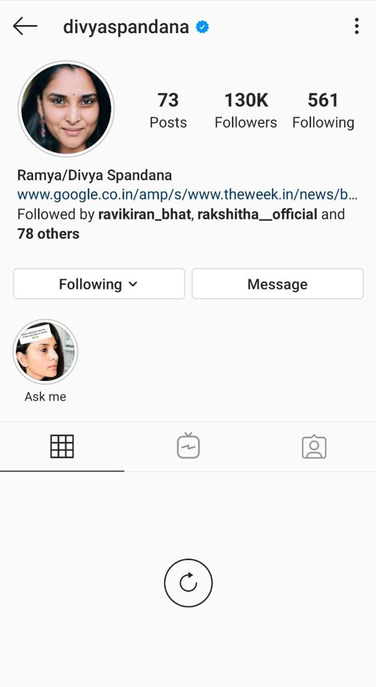 ಇದ್ದಕ್ಕಿದ್ದಂತೆ ಸ್ಯಾಂಡಲ್ವುಡ್ ಮೋಹಕತಾರೆ ರಮ್ಯಾ ಇನ್ಸ್ಟಾಗ್ರಾಂ ಅಕೌಂಟ್ನಲ್ಲಿ ಸಮಸ್ಯೆ ಶುರವಾಗಿದೆ. ಯಾವುದೇ ಪೋಸ್ಟ್ ಕಾಣಿಸದ ಕಾರಣ ಅಭಿಮಾನಿಗಳ ಸಹಾಯ ಯಾಚಿಸಿದ್ದಾರೆ.