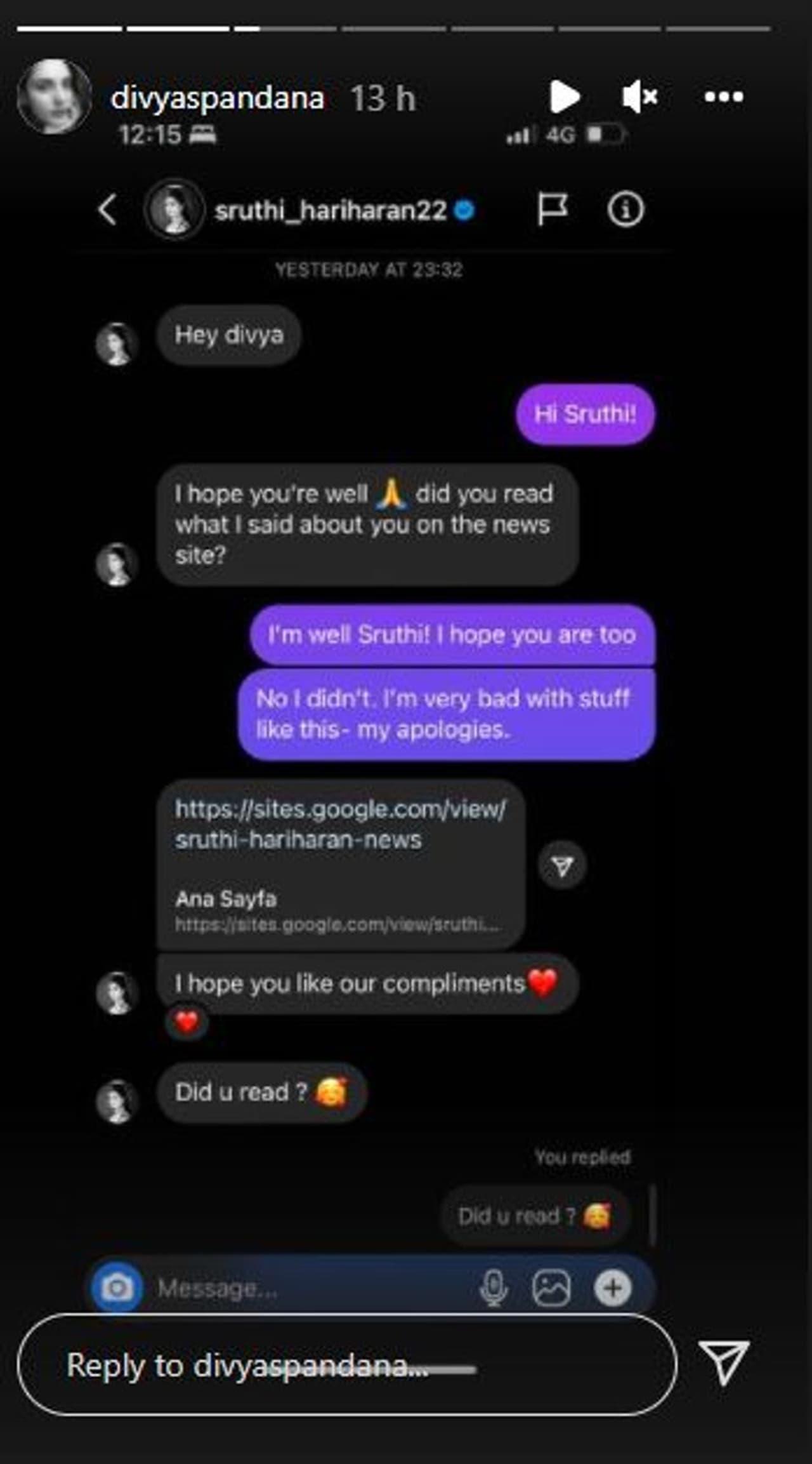 ರಮ್ಯಾ ಅವರಿಗೆ ಇನ್ಸ್ಟಾಗ್ರಾಂ (Instagram) ಖಾತೆ ಮೂಲಕ ನಟಿ ಶ್ರುತಿ ಹರಿಹರನ್ ಮೆಸೇಜ್ ಮಾಡುತ್ತಾರೆ.