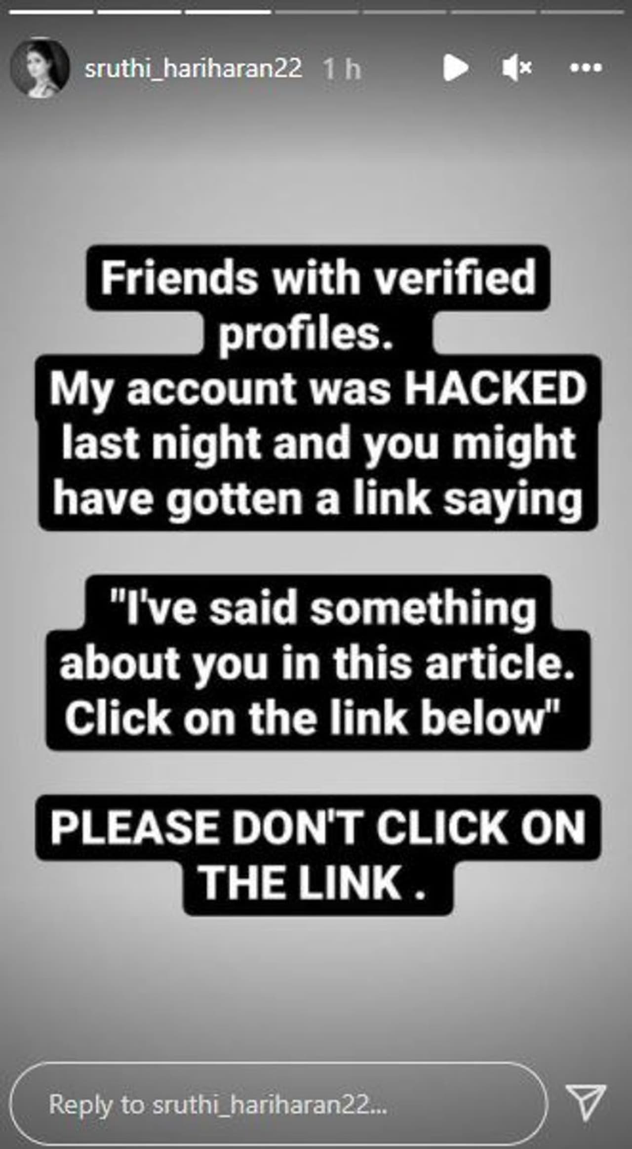 ಇದಾದ ಕೆಲವು ನಿಮಿಷಗಳಲ್ಲಿ ಶ್ರುತಿ ಇನ್ಸ್ಟಾಗ್ರಾಂನಲ್ಲಿ ಹ್ಯಾಕ್ ಬಗ್ಗೆ ಬರೆದುಕೊಂಡಿದ್ದಾರೆ. 'ನನ್ನ ಖಾತೆಯನ್ನು ಯಾರೋ ಹ್ಯಾಕ್ ಮಾಡಿ ವಿಚಿತ್ರ ಮೆಸೇಜ್ಗಳನ್ನು ಕಳುಹಿಸುತ್ತಿದ್ದಾರೆ. ದಯವಿಟ್ಟು ಕ್ಷಮಿಸಿ. ನನ್ನಿಂದ ಮೆಸೇಜ್ ಪಡೆದುಕೊಂಡಿರುವವರು ಯಾರೂ ಈ ಲಿಂಕ್ನ ಕ್ಲಿಕ್ ಮಾಡಬೇಡಿ. ಸೆಲೆಬ್ರಿಟಿಗಳು ಮತ್ತು ವೆರಿಫೈಡ್ ಖಾತೆಗಳಿಗೆ ಮಾತ್ರ ಲಿಂಕ್ ಕಳುಹಿಸಲಾಗಿದೆ' ಎಂದು ಶ್ರುತಿ ಬರೆದುಕೊಂಡಿದ್ದಾರೆ.