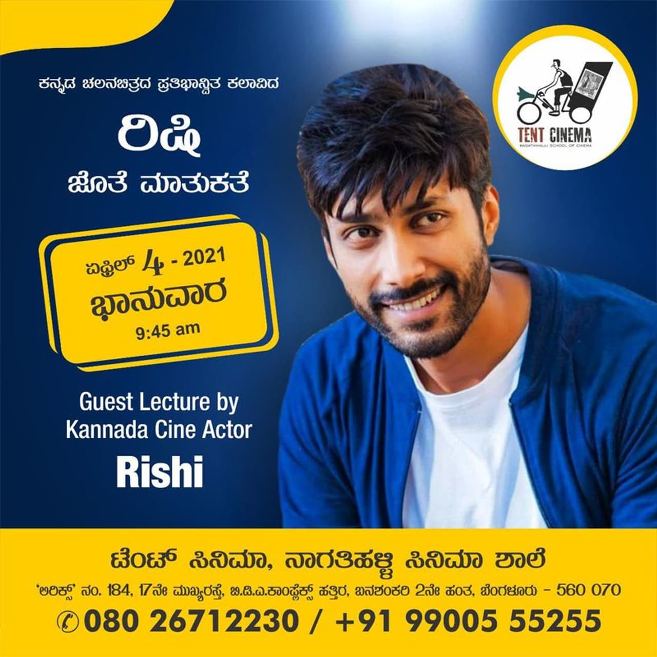 ಟೆಂಟ್ ಸಿನಿಮಾ - ನಾಗತಿಹಳ್ಳಿ ಸಿನಿಮಾ ಶಾಲೆಯಲ್ಲಿ ಸ್ಯಾಂಡಲ್ವುಡ್ ನಟ ರಿಷಿ ವಿಶೇಷ ಭಾಷಣ ಮಾಡಲಿದ್ದಾರೆ. ಸ್ಯಾಂಡಲ್ವುಡ್ನ ಪ್ರತಿಭಾನ್ವಿತ ನಟ ರಿಷಿ ಜೊತೆ ಮಾತುಕತೆ ನಡೆಯಲಿದೆ.