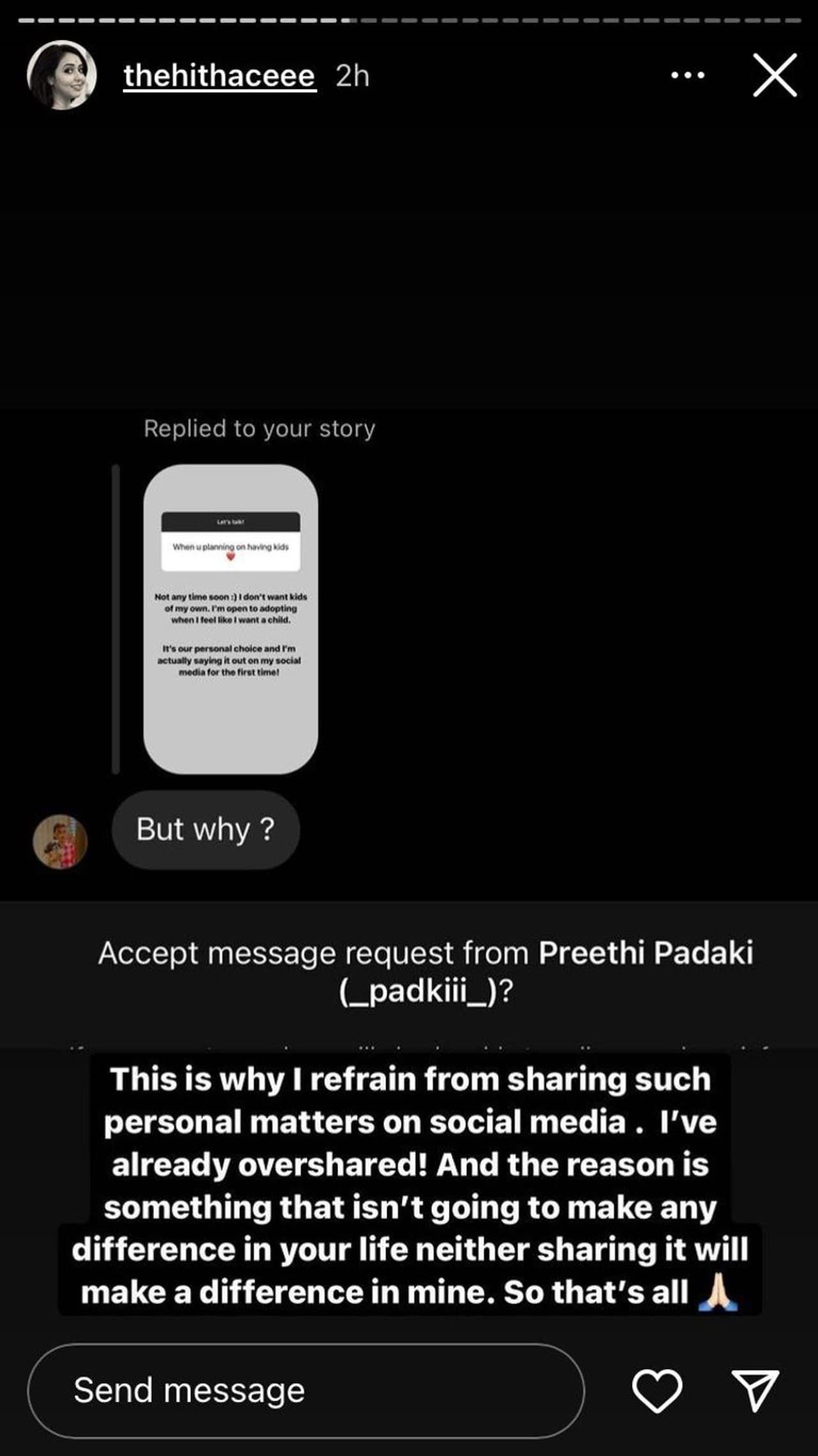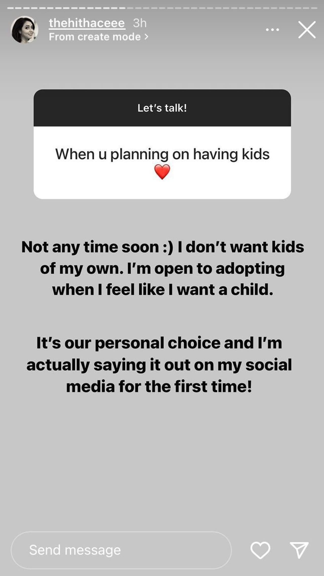 ನೆಟ್ಟಿಗನೊಬ್ಬ 'ಮಕ್ಕಳು ಮಾಡಿಕೊಳ್ಳುವುದಕ್ಕೆ ಪ್ಲ್ಯಾನ್ ಮಾಡುತ್ತಿದ್ದೀರಾ?' ಎಂದು ಕೇಳಿದ್ದಾರೆ. ಅದಕ್ಕೆ ಹಿತಾ ಸೂಕ್ಷ್ಮವಾಗಿ ಉತ್ತರ ಕೊಟ್ಟಿದ್ದಾರೆ. 'ಸದ್ಯಕ್ಕೆ ಅದರ ಬಗ್ಗೆ ಪ್ಲ್ಯಾನ್ ಇಲ್ಲ. ನನಗೆ ನನ್ನ ಸ್ವಂತ ಮಕ್ಕಳು ಅಂತ ಬೇಡ ನನಗೆ ಮಕ್ಕಳು ಬೇಕು ಅನಿಸಿದಾಗ ನಾನು ದತ್ತು ತೆಗೆದುಕೊಳ್ಳುವುದಕ್ಕೆ ರೆಡಿಯಾಗಿರುವೆ. ಇದು ನಮ್ಮ ಪರ್ಸನಲ್ ಆಯ್ಕೆ ಹಾಗೆ ಸೋಷಿಯಲ್ ಮೀಡಿಯಾದಲ್ಲಿ ನಾನು ಇದರ ಬಗ್ಗೆ ಮೊದಲ ಬಾರಿ ಹೇಳಿಕೊಳ್ಳುತ್ತಿರುವೆ' ಎಂದು ಹಿತಾ ಬರೆದುಕೊಂಡಿದ್ದರು.