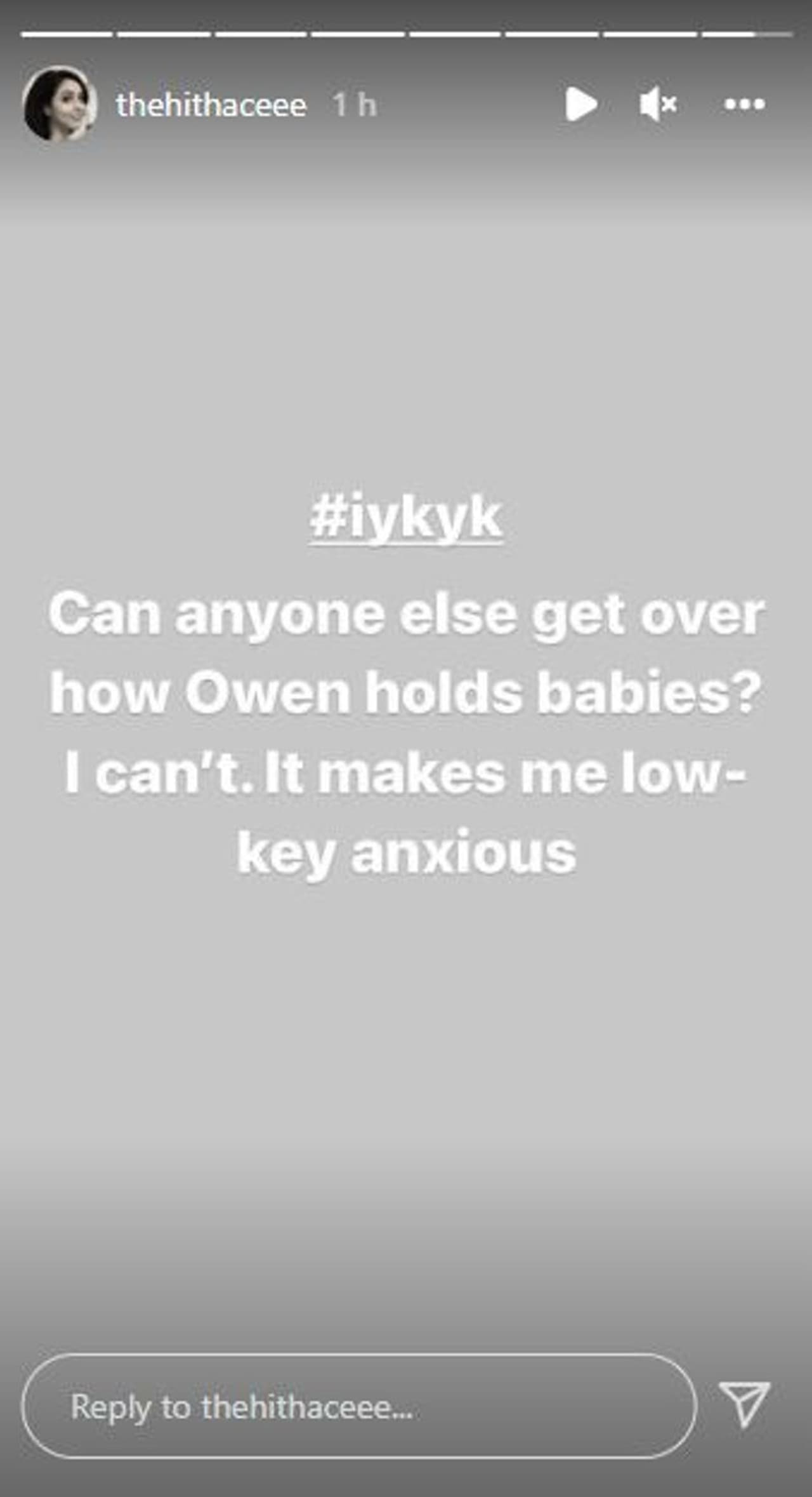 ಇವತ್ತು ಮತ್ತೊಂದು ಸ್ಟೋರಿಯಲ್ಲಿ 'Owen ಮಕ್ಕಳನ್ನು ಹೇಗೆ ಹಿಡಿದುಕೊಳ್ಳುತ್ತಾರೆ? ನನಗೆ ಆಗುವುದಿಲ್ಲ. ನನಗೆ ಲೋ ಕೀ ಆತಂಕ ಶುರುವಾಗುತ್ತದೆ' ಎಂದು ಬರೆದುಕೊಂಡಿದ್ದಾರೆ.