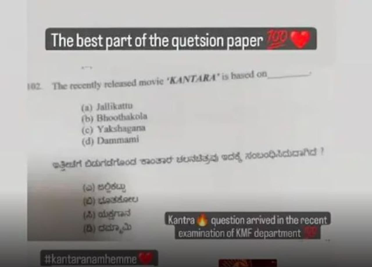ಖಂಡಿತ ಪ್ರತಿಯೊಬ್ಬ ಕನ್ನಡಿಗನೂ ಕಾಂತಾರ ಸಿನಿಮಾ ನೋಡಿ ಸರಿಯಾದ ಉತ್ತರ ಕೊಟ್ಟಿರುತ್ತಾರೆ. 'ಪ್ರಶ್ನೆ ಪತ್ರಿಕೆಯಲ್ಲಿ ಕೇಳಿರುವ ಬೆಸ್ಟ್ ಪ್ರಶ್ನೆ ಇದು. ಕಾಂತಾರ ಚಿತ್ರದ ಬಗ್ಗೆ ಇತ್ತೀಚಿಗೆ ನಡೆದ ಕೆಎಮ್ಎಫ್ ಪರೀಕ್ಷೆಯಲ್ಲಿ ಕೇಳಲಾಗಿದೆ' ಎಂದು ಸಪ್ತಮಿ ಬರೆದುಕೊಂಡಿದ್ದಾರೆ. ಈ ಪ್ರಶ್ನೆಗೆ ಸರಿಯಾದ ಉತ್ತರ ಭೂತಕೋಲ.
