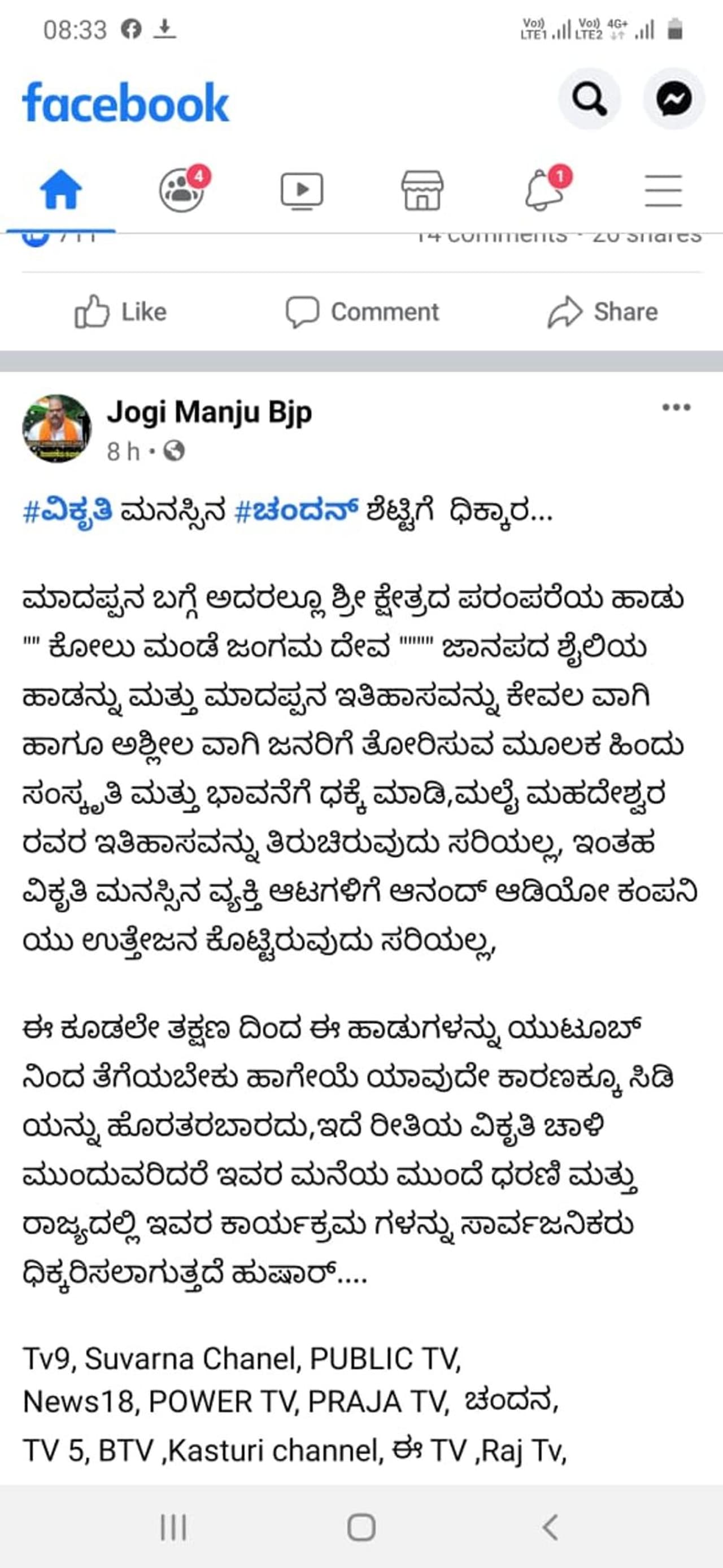 'ಹಿಂದು ಸಂಸ್ಕೃತಿ ಮತ್ತು ಭಾವನೆಗೆ ಧಕ್ಕೆ ಮಾಡಿ ಮಲೈ ಮಹದೇಶ್ವರ ಇತಿಹಾಸವನ್ನು ತಿರುಚುವುದು ಸರಿ ಅಲ್ಲ. ಇಂಥ ವಿಕೃತಿಯ ಮನಸ್ಸಿನ ವ್ಯಕ್ತಿಯ ಆಟಕ್ಕೆ ಆನಂದ್ ಆಡಿಯೋ ಕಂಪನಿ ಉತ್ತೇಜನ ಕೊಟ್ಟಿರುವುದೂ ಸರಿಯಲ್ಲ. ಇವರು ವಿಕೃತಿ ಚಾಳಿ ಮುಂದುವರಿದರೆ ಇವರ ಮನೆ ಮುಂದೆ ಧರಣಿ ಕೂರಲಾಗುತ್ತದೆ. ರಾಜ್ಯದಲ್ಲಿ ಇವರ ಕಾರ್ಯಕ್ರಮಗಳನ್ನು ಸಾರ್ವಜನಿಕರು ಧಿಕ್ಕರಿಸಬೇಕಾಗುತ್ತದೆ, ಎಚ್ಚರ,' ಎಂದು ಜೋಗಿ ಮಂಜು ಬರೆದುಕೊಂಡಿದ್ದಾರೆ.