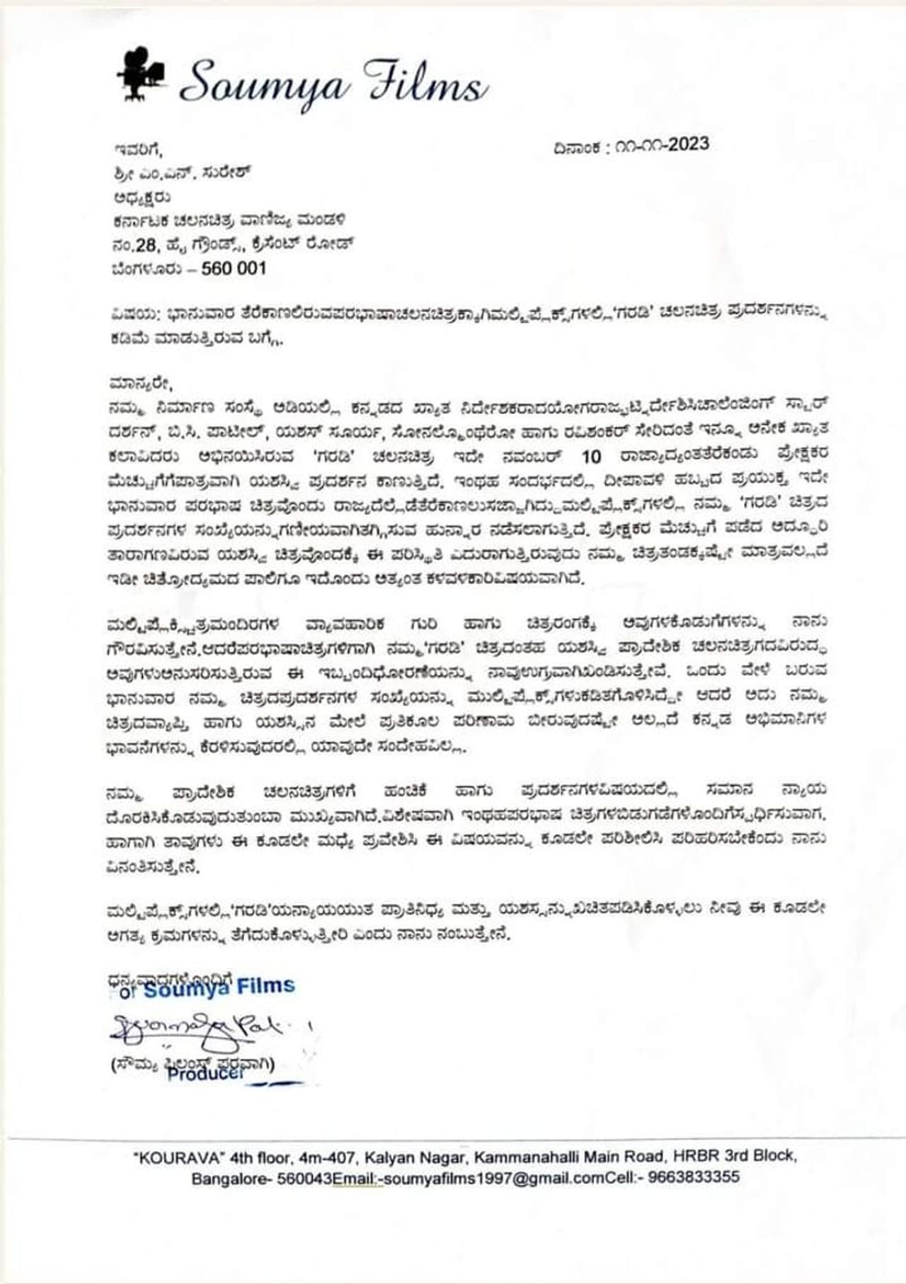 ನಮ್ಮ ಪ್ರಾದೇಶಿಕ ಚಲನಚಿತ್ರಗಳಿಗೆ ಹಂಚಿಕೆ ಹಾಗೂ ಪ್ರದರ್ಶನಗಳ ವಿಷಯದಲ್ಲಿ ಸಮಾನ ನ್ಯಾಯ ದೊರಕಿಸಿಕೊಡುವುದು ತುಂಬಾ ಮುಖ್ಯವಾಗಿದೆ. ವಿಶೇಷವಾಗಿ ಇಂತಹ ಪರಭಾಷ ಚಿತ್ರಗಳ ಬಿಡುಗಡೆಗಳೊಂದಿಗೆ ಸ್ಪರ್ಧಿಸುವಾಗ. ಹಾಗಾಗಿ ತಾವುಗಳು ಈ ಕೂಡಲೇ ಮಧ್ಯೆ ಪ್ರವೇಶಿಸಿ ಈ ವಿಷಯವನ್ನು ಕೂಡಲೇ ಪರಿಶೀಲಿಸಿ ಪರಿಹರಿಸಬೇಕೆಂದು ನಾನು ವಿನಂತಿಸುತ್ತೇನೆ. ಮಲ್ಟಿಫೆಕ್ಸ್ಗಳಲ್ಲಿ 'ಗರಡಿ'ಗೆ ನ್ಯಾಯಯುತವಾದ ಪ್ರಾತಿನಿಧ್ಯ ಮತ್ತು ಯಶಸ್ಸನ್ನು ಖಚಿತಪಡಿಸಿಕೊಳ್ಳಲು ನೀವು ಈ ಕೂಡಲೇ ಅಗತ್ಯ ಕ್ರಮಗಳನ್ನು ತೆಗೆದುಕೊಳ್ಳುತ್ತೀರಿ ಎಂದು ನಾನು ನಂಬುತ್ತೇನೆ.'ಎಂದು ಬರೆಯಲಾಗಿದೆ.
