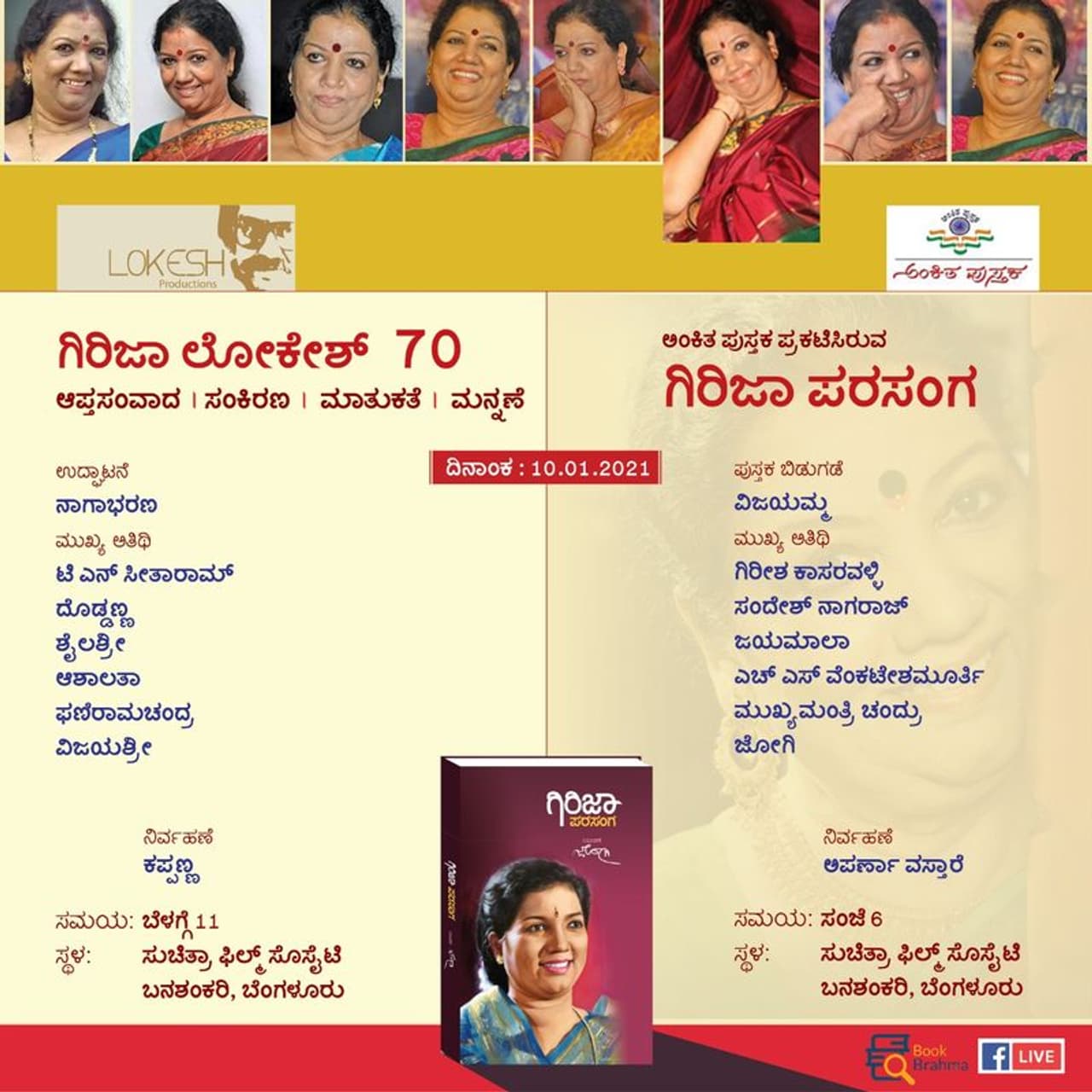 ಹಿರಿಯ ನಟಿ ಗಿರಿಜಾ ಲೋಕೇಶ್ ಜೀವನ ಕಥನ/ ಜನವರಿ 10 ಇಡೀ ದಿನ ಕಾರ್ಯಕ್ರಮ/ ಬೆಳಗ್ಗೆ ಗಿರಿಜಾ ಲೋಕೇಶ್ 70-/ ಸಂಜೆ 'ಗಿರಿಜಾ ಪರಸಂಗ' ಪುಸ್ತಕ ಬಿಡುಗಡೆ