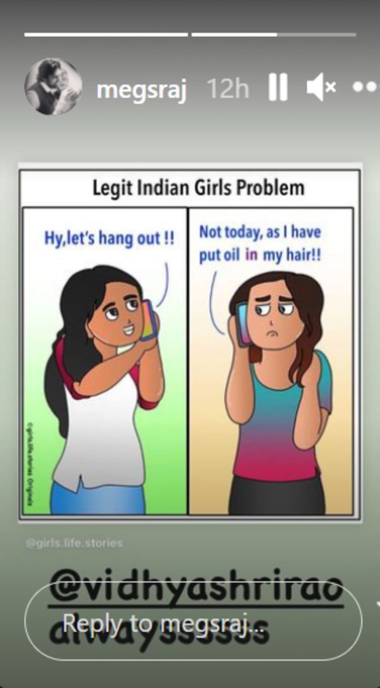 ಭಾರತೀಯ ಹುಡುಗಿ ತನ್ನ ಸ್ನೇಹಿತೆಯರೊಂದಿಗೆ ಯಾವುದಾದರೂ ಪ್ಲಾನ್ ಮಾಡೋ ಮೊದಲು ಎದುರಿಸುತ್ತಿರುವ ಸಮಸ್ಯೆಗಳ ಬಗ್ಗೆ ಹಾಸ್ಯಕರವಾದ ಸಂಗತಿಯನ್ನು ಹಂಚಿಕೊಂಡಿದ್ದಾರೆ ಮೇಘನಾ ರಾಜ್.