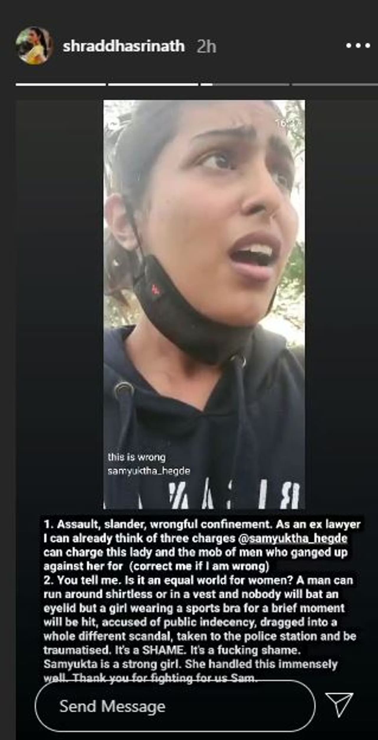 ನಟಿ ಶ್ರದ್ಧಾ ಶ್ರೀನಾಥ್ ಅವರ ಲಾಯರ್ ಇನ್ಸ್ಟಾಗ್ರಾಂ ಸ್ಟೋರಿಯಲ್ಲಿ ಆ ಮಹಿಳೆ ವಿರುದ್ಧ ಹಾಕಬಹುದಾದ ಕೇಸ್ ಬಗ್ಗೆ ತಿಳಿಸಿದ್ದಾರೆ. ನಟಿ ವೈನಿಧಿ ಜಗದೀಶ್, ಅಮೃತಾ ಐಯರ್, ನಿಶ್ವಿಕಾ, ಆರ್ಜೆ ಸಿರಿ ಸೇರಿ ಅನೇಕರು ಸಂಯುಕ್ತಾ ಪರ ನಿಂತು ಮಾತನಾಡಿದ್ದಾರೆ. 'ಜಿಮ್ ಬಟ್ಟೆಯನ್ನು ಅಶ್ಲೀಲ ಎಂದು ಹೇಳಿದ್ದು ತಪ್ಪು, ಈಗಿನ ಕಾಲದಲ್ಲೂ ಈ ರೀತಿ ಮಾತನಾಡಿರುವ ಮಹಿಳೆಯನ್ನು ವಿರೋಧಿಸಿದ್ದಾರೆ. ಅಲ್ಲದೇ ಒಬ್ಬ ಮಹಿಳೆ ಮತ್ತೊಬ್ಬ ಮಹಿಳೆ ಜೊತೆಯಾಗಿ ನಿಲ್ಲುವುದನ್ನು ಬಿಟ್ಟು, ಈ ರೀತಿ ಪ್ರಶ್ನಿಸುವುದು ಸರಿಯೇ ಎಂದು #StandWithSamyuktha ಎಂಬ ಹ್ಯಾಷ್ ಟ್ಯಾಗ್ ಹಾಕಿ ಸೋಷಿಯಲ್ ಮೀಡಿಯಾದಲ್ಲಿ ಪೋಸ್ಟ್ ಒಂದನ್ನು ಶೇರ್ ಮಾಡಿದ್ದಾರೆ.
