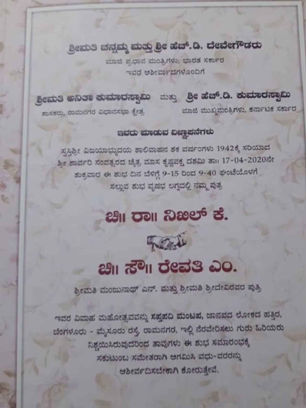 ಶ್ರೀಮತಿ ಚನ್ನಮ್ಮ ಮತ್ತು ಶ್ರೀ ಎಚ್ .ಡಿ.ದೇವೇಗೌಡರ ಹೆಸರಿನ ಮೂಲಕವೇ ಪ್ರಾರಂಭಗೊಂಡಿರುವ ಆಹ್ವಾನ ಪತ್ರಿಕೆಯಲ್ಲಿ ಏಪ್ರಿಲ್ 17ರ ಶುಕ್ರವಾರ ಬೆಳಗ್ಗೆ 9.15ರಿಂದ 9.40ಯೊಳಗೆ ಧಾರಮೂಹೂರ್ತ ರಾಮನಗರದ ಜಾನಪದ ಲೋಕ ಸಮೀಪದ ಸಪ್ತಪದಿ ಮಂಟಪದಲ್ಲಿ ನಡೆಯಲಿದೆ ಎಂದು ವಿವರಿಸಲಾಗಿದೆ.