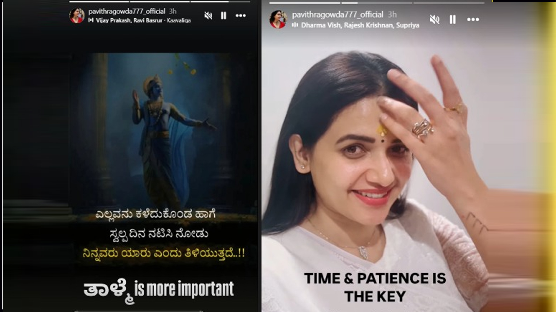ಪವಿತ್ರ ಅವರು ತಮ್ಮ ಇನ್ಸ್ಟಾ ಸ್ಟೋರೀಸ್ನಲ್ಲಿ ಸಮಯ ಹಾಗೂ ತಾಳ್ಮೆ ಕೀಲಿಕೈ. ಎಲ್ಲಾ ಪ್ರಶ್ನೆಗಳಿಗೆ ನಿಶ್ಯಬ್ದವೇ ಒಳ್ಳೆ ಉತ್ತರ. ಎಲ್ಲಾ ಪರಿಸ್ಥಿತಿಯಲ್ಲಿ ನಗು ಉತ್ತಮ ಪ್ರತಿಕ್ರಿಯೆ. ಆದರೆ ಇದಕ್ಕಿಂತಲೂ ಹೆಚ್ಚು ಗಮನ ಸೆಳೆದಿರುವುದು ಎಲ್ಲವನ್ನೂ ಕಳೆದುಕೊಂಡ ಹಾಗೆ ಸ್ವಲ್ಪ ದಿನ ನಟಿಸಿ ನೋಡು ನಿನ್ನವರು ಯಾರು ಎಂದು ತಿಳಿಯುತ್ತದೆ. ತಾಳ್ಮೆ is important ಎಂದು ಬರೆದುಕೊಂಡಿದ್ದಾರೆ. ಹಾಗಿದ್ದರೆ ಜೈಲಿನಿಂದ ಹೊರಕ್ಕೆ ಬಂದ ಮೇಲೆ ಮಾಡ್ತಿರೋದು ನಟನೆಯಾ? ಸ್ವಲ್ಪ ದಿನ ಸುಮ್ಮನೇ ಇದ್ದು ಕೊನೆಗೆ ಮಾಡುವುದು ಏನು? ಎಷ್ಟು ದಿನ ತಾಳ್ಮೆಯಿಂದ ಕಾಯತ್ತಾರೆ, ಆ ಬಳಿಕ ಏನಾಗುತ್ತದೆ ಎನ್ನುವ ಪ್ರಶ್ನೆಗಳೆಲ್ಲಾ ಈ ಪೋಸ್ಟ್ನಿಂದ ಕೇಳಿಬರುತ್ತಿದೆ.