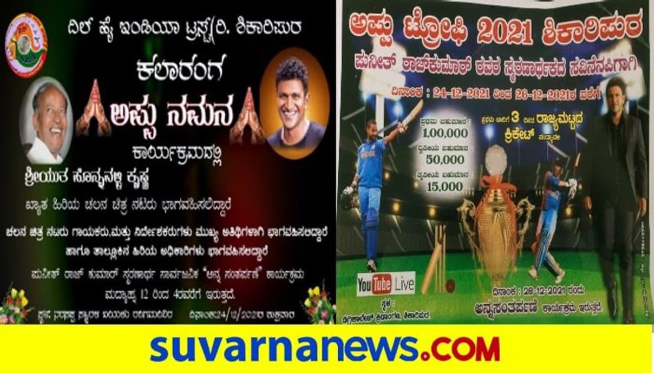 'ಅಪ್ಪು ಟ್ರೋಫಿ 2021 ಶಿಕಾರಿಪುರ' ಎಂಬ ಹೆಸರಿನಲ್ಲಿ ಪುನೀತ್ ರಾಜ್ಕುಮಾರ್ ಅವರ ಸ್ಮರಣಾರ್ಥಕದ ಸವಿನೆನಪಿಗಾಗಿ ಡಿಸೆಂಬರ್ 24 ರಂದು ಬೆಳಿಗ್ಗೆ ಶಿಕಾರಿಪುರ ಪಟ್ಟಣದ ಡಿಗ್ರಿ ಕಾಲೇಜು ಕ್ರೀಡಾಂಗಣದಲ್ಲಿ ರಾಜ್ಯ ಮಟ್ಟದ ಕ್ರಿಕೆಟ್ ಟೂರ್ನಮೆಂಟ್ ನಡೆಯಲಿದೆ. ಪುನೀತ್ ರಾಜ್ಕುಮಾರ್ ಅವರ ಅಭಿಮಾನಿ ಯುವಕರು ಈ ಪಂದ್ಯಾವಳಿಯನ್ನು ನಡೆಸುತ್ತಿದ್ದಾರೆ. ಡಿಸೆಂಬರ್ 24ರಿಂದ ನಡೆಯಲಿರುವ ಈ ಕ್ರಿಕೆಟ್ ಟೂರ್ನಮೆಂಟ್ ನಡೆಯಲಿದ್ದು, ಮೊದಲ ಬಾರಿಗೆ ಮೂರು ದಿನದ ರಾಜ್ಯಮಟ್ಟದ ಕ್ರಿಕೆಟ್ ಪಂದ್ಯಾವಳಿ ಆಯೋಜನೆಗೊಂಡಿದೆ. ಜೊತೆಗೆ ಯೂಟ್ಯೂಬ್ನಲ್ಲಿ ನೇರ ಪ್ರಸಾರದ ವ್ಯವಸ್ಥೆಯನ್ನು ಮಾಡಲಾಗಿದೆ.