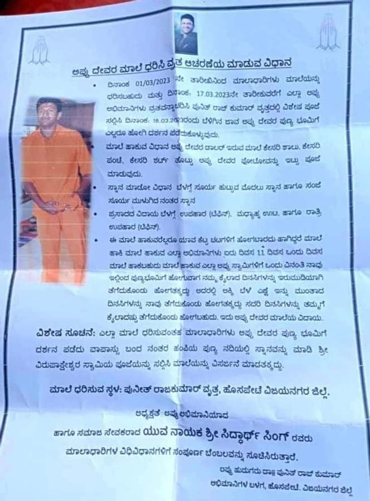 'ದಿನಾಂಕ ಮಾರ್ಚ್ 1, 2023ರಂದು ಮಾಲಾಧಾರಿಗಳು ಮಾಲೆಯನ್ನು ಧರಿಸಬಹುದು ಮತ್ತು ದಿನಾಂಕ ಮಾರ್ಚ್ 17,2023ರಂದು ಎಲ್ಲಾ ಅಪ್ಪು ಅಭಿಮಾನಿಗಳು ವ್ರತವನ್ನು ಆಚರಿಸಿ ಪುನೀತ್ ರಾಜ್ಕುಮಾರ್ ವೃತ್ತದಲ್ಲಿ ವಿಶೇಷ ಪೂಜೆ ಸಲ್ಲಿಸಿ ದಿನಾಂಕ ಮಾರ್ಚ್ 18, 2023ರಂದು ಬೆಳಗಿನ ಜಾವ ಅಪ್ಪು ದೇವರ ಪುನ್ಯ ಭೂಮಿಗೆ ಎಲ್ಲರೂ ಹೋಗಿ ದರ್ಶನ ಪಡೆದುಕೊಳ್ಳುವುದು'