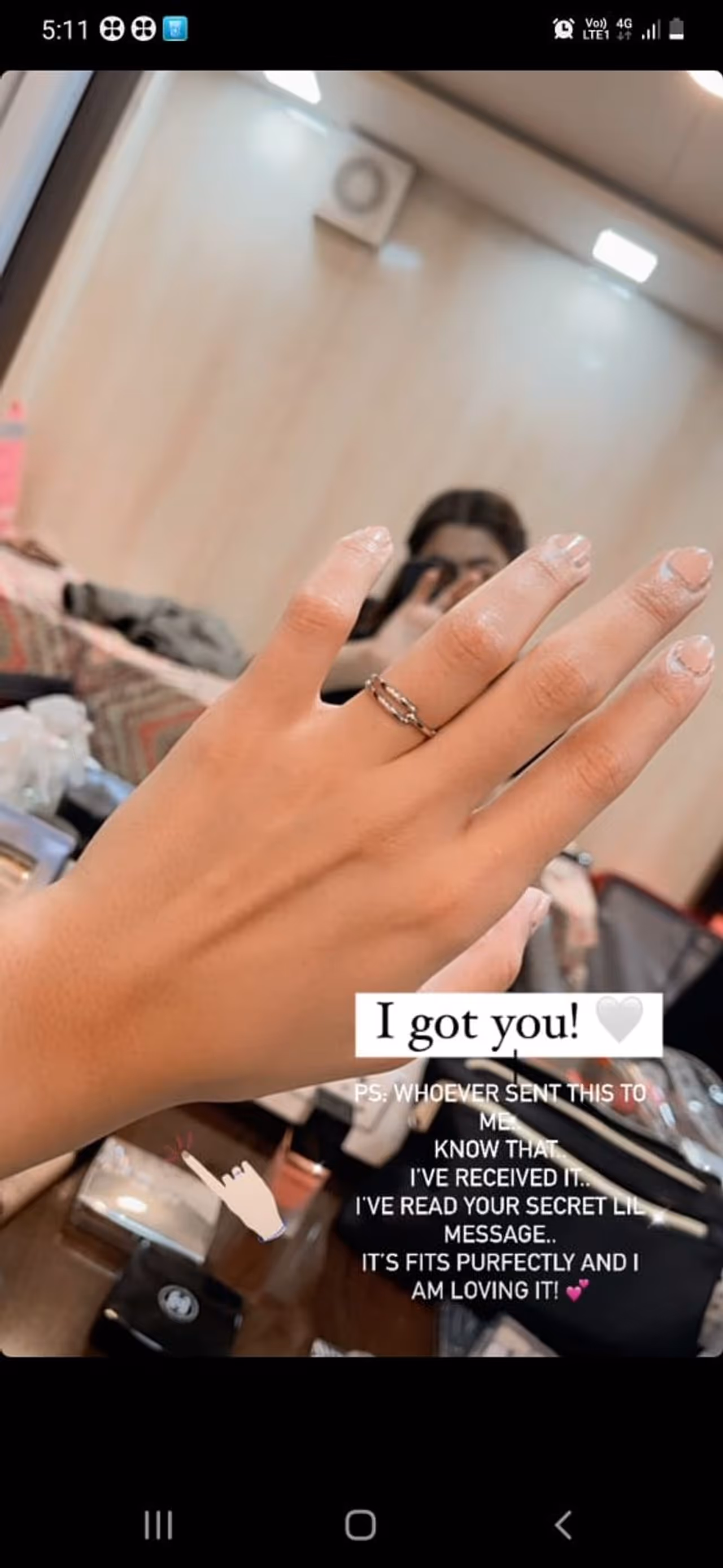 ಶೂಟಿಂಗ್ ಆರಂಭಿಸುವ ಮುನ್ನ ಕ್ಯಾರವಾನ್ನಲ್ಲಿ ಮೇಕಪ್ ಮಾಡಿಕೊಳ್ಳುತ್ತಿರುವ ರಶ್ಮಿಕಾ ಮಂದಣ್ಣ, ಕೈಗೆ ಧರಿಸಿರುವ ಉಂಗುರದ ಫೋಟೋ ಕ್ಲಿಕ್ ಮಾಡಿ ' I Got You...ನಾನು ಇದನ್ನು ಸ್ವೀಕರಿಸಿದ್ದೇನೆ. ನಾನು ನಿಮ್ಮ ರಹಸ್ಯವಾದ ಪುಟ್ಟ ಸಂದೇಶವನ್ನು ಓದಿದ್ದೇನೆ. ಉಂಗುರ ನನಗೆ ಪರ್ಫೆಕ್ಟ್ ಆಗಿ ಫಿಟ್ ಆಗುತ್ತದೆ. ನನಗೆ ಇಷ್ಟವಾಗಿದೆ,' ಎಂದು ಬರೆದುಕೊಂಡಿದ್ದಾರೆ.