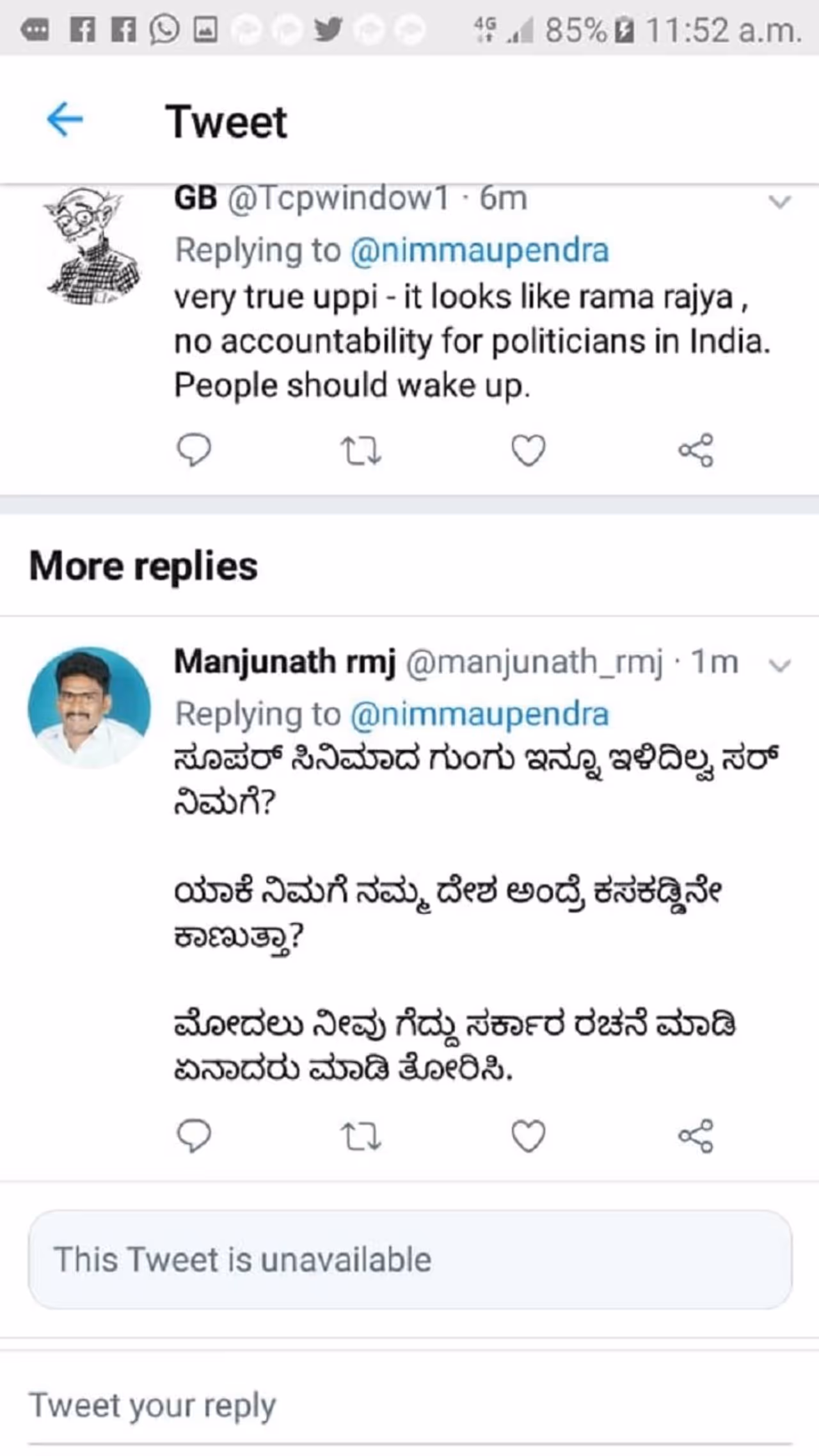 ಸೂಪರ್ ಸಿನಿಮಾದ ಗುಂಗು ಇನ್ನೂ ಇಳಿದಿಲ್ವ ಸರ್ ನಿಮಗೆ? ಯಾಕೆ ನಿಮಗೆ ನಮ್ಮ ದೇಶ ಅಂದ್ರೆ ಕಸಕಡ್ಡಿನೇ ಕಾಣುತ್ತಾ? ಮೊದಲು ನೀವು ಗೆದ್ದು ಸರ್ಕಾರ ರಚನೆ ಮಾಡಿ. ಏನಾದ್ರೂ ಮಾಡಿ ತೋರಿಸಿ ಎಂದು ನಟ ಉಪೇಂದ್ರರನ್ನು ಸಾರ್ವಜನಿಕರು ತರಾಟೆಗೆ ತೆಗೆದುಕೊಂಡಿದ್ದಾರೆ.