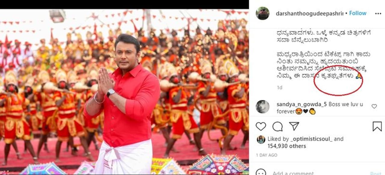 ಟಿಕೆಟ್ ಖರೀದಿಸಿ ಸಿನಿಮಾ ನೋಡಿದ ಅಭಿಮಾನಿಗಳಿಗೆ ಥ್ಯಾಂಕ್ಸ್ ಹೇಳಿದ ಡಿಬಾಸ್ | ಕೃತಜ್ಞತೆ ಹೇಳೋವಲ್ಲಿ ಹೇಳಿದ್ದು ಮಾತ್ರ ಕೃತಘ್ನತೆ...!