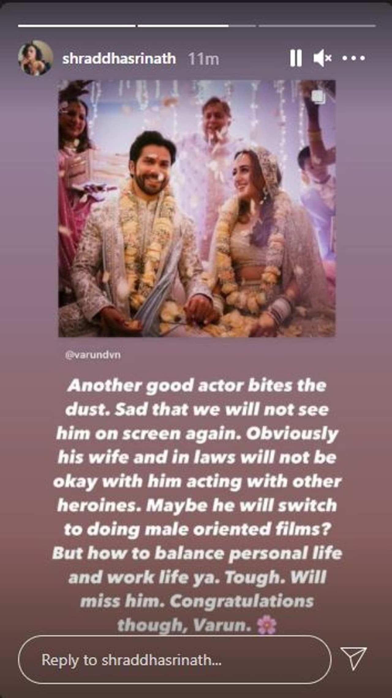 'ಮತ್ತೊಬ್ಬ ಅದ್ಭುತ ಕಲಾವಿದ ಮದುವೆಯಾಗಿದ್ದಾರೆ. ವರುಣ್ ಮತ್ತೆ ಸಿನಿಮಾ ಮಾಡುತ್ತಾರಾ? ಅವರನ್ನು ಮತ್ತೆ ಆನ್ ಸ್ಕ್ರೀನ್ ನೋಡ್ತೀವೋ ಇಲ್ಲವೋ ಅಂತ ಬೇಸರ. ಹೆಂಡತಿ ಹಾಗೂ ಅತ್ತೆ-ಮಾತು ಖಂಡಿತವಾಗಿಯೂ ವರುಣ್ ಅವರನ್ನು ಬೇರೆ ನಟಿಯರ ಜೊತೆ ನೋಡಲು ಇಷ್ಟ ಪಡುವುದಿಲ್ಲ. ಮದುವೆ ಆಗಿದೆ ಎನ್ನುವ ಕಾರಣ ಪುರುಷ ಪ್ರಧಾನ ಚಿತ್ರಗಳಲ್ಲಿ ಅಭಿನಯಿಸಬಹುದು. ಆದರೂ ಪರ್ಸನಲ್ ಲೈಫ್ ಹಾಗೂ ವರ್ಕ್ ಲೈಫ್ ಹೇಗೆ ಸಂಭಾಳಿಸುತ್ತಾರೋ ಏನೋ. ಕಷ್ಟವಿದೆ. ವರುಣ್ನನ್ನು ಮಿಸ್ ಮಾಡಿಕೊಳ್ಳುತ್ತೀನಿ. ಶುಭವಾಗಲಿ ವರುಣ್,' ಎಂದು ಶ್ರದ್ಧಾ ಶ್ರೀನಾಥ್ ಬರೆದುಕೊಂಡಿದ್ದಾರೆ.