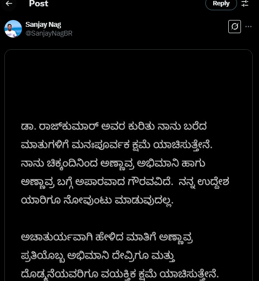 ಕನ್ನಡದಲ್ಲಿ ಎಕ್ಸ್ ಮೂಲಕ ಪೋಸ್ಟ್ ಮಾಡಿರುವ ಸಂಜಯ್ ನಾಗ್ ದೊಡ್ಮನೆ, ಡಾ.ರಾಜ್ ಅಭಿಮಾನಿಗಳ ಬಳಿ ಭೇಷರತ್ ಕ್ಷಮೆ ಯಾಚಿಸಿದ್ದಾನೆ. ಡಾ.ರಾಜ್ ಕುಮಾರ್ ಅವರ ಕುರಿತು ನಾನು ಬರೆದ ಮಾತುಗಳಿಗೆ ಮನಃಪೂರ್ವಕ ಕ್ಷಮೆ ಯಾಚಿಸುತ್ತೇನೆ. ನಾನು ಚಿಕ್ಕಂದಿನಿಂದಲೂ ಅಣ್ಣಾವ್ರ ಅಭಿಮಾನಿ ಹಾಗೂ ಅಣ್ಣಾವ್ರ ಬಗ್ಗೆ ಅಪಾರ ಗೌರವವಿದೆ. ನನ್ನ ಉದ್ದೇಶ ಯಾರಿಗೂ ನೋವುಂಟ ಮಾಡುವುದ್ದಲ್ಲ. ಅಚಾತುರ್ಯವಾಗಿ ಹೇಳಿದ ಮಾತಿಗೆ ಅಣ್ಣಾವ್ರ ಪ್ರತಿಯೊಬ್ಬ ಅಭಿಮಾನಿ ದೇವ್ರಿಗೂ ಮತ್ತು ದೊಡ್ಮನೆಯವರಿಗೆ ವೈಯುಕ್ತಿಕವಾಗಿ ಕ್ಷಮೆ ಯಾಚಿಸುತ್ತೇನೆ ಎಂದು ಟ್ವೀಟ್ ಮಾಡಿದ್ದಾನೆ.