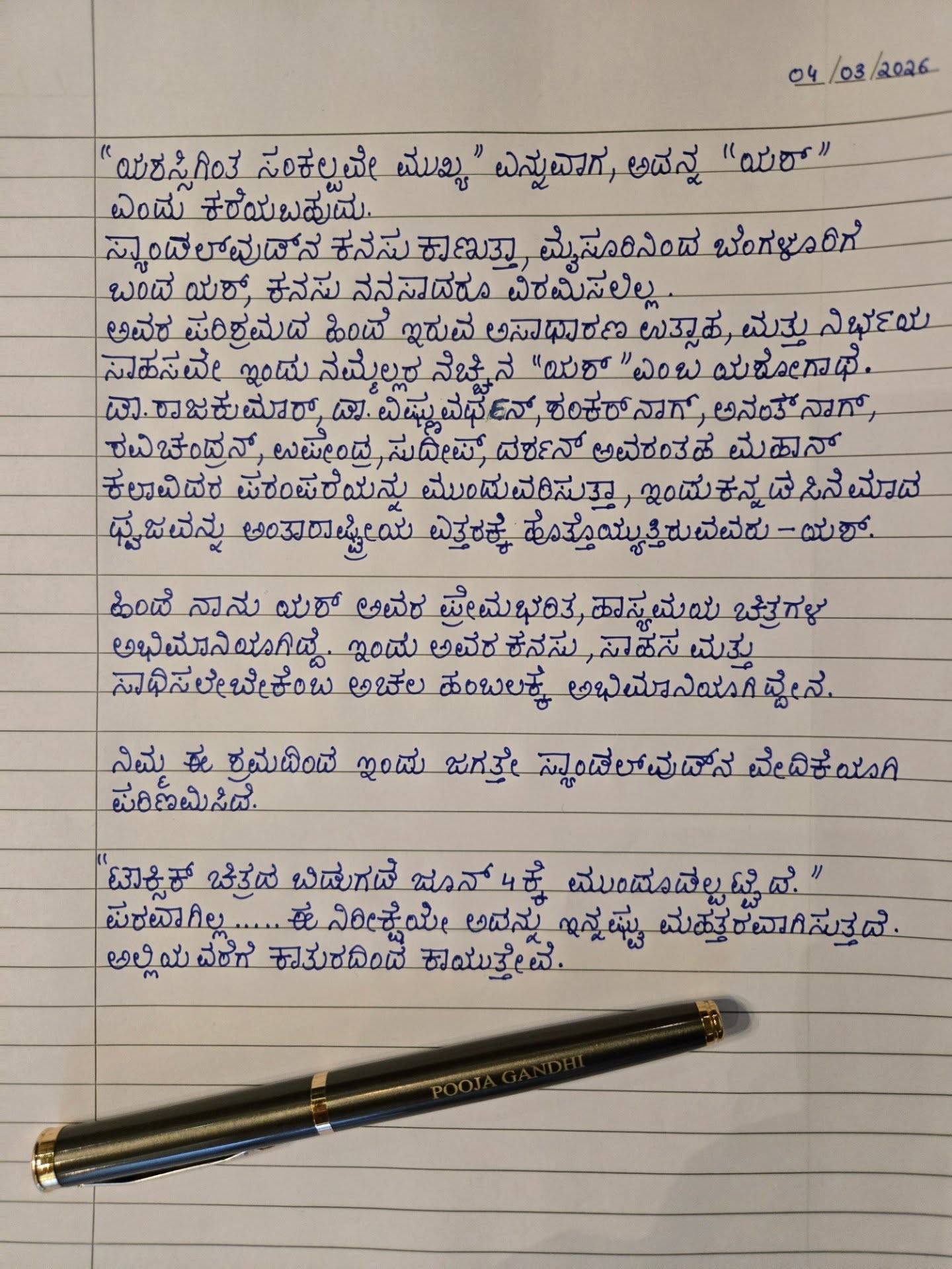ಪರಭಾಷೆಯಿಂದ ಬಂದು ಕನ್ನಡವನ್ನು ಅಪ್ಪಿ, ಒಪ್ಪಿ, ಇಂದು ಕನ್ನಡದ ಅಕ್ಷರಗಳಲ್ಲೇ ತನ್ನ ಭಾವನೆಯನ್ನು ವ್ಯಕ್ತಪಡಿಸುತ್ತಿರುವ ಪೂಜಾ ಗಾಂಧಿ ಅವರ ಈ ಕಾರ್ಯಕ್ಕೆ ಎಲ್ಲೆಡೆ ಶ್ಲಾಘನೆ ವ್ಯಕ್ತವಾಗುತ್ತಿದೆ. ಯಶ್ ಎಂಬ ಯಶೋಗಾಥೆಗೆ ಪೂಜಾ ಅವರ ಈ ಪತ್ರ ಹೊಸ ಮೆರುಗು ನೀಡಿದೆ!. ಒಮ್ಮೆ ಈ ಪತ್ರ ನೋಡಿ..