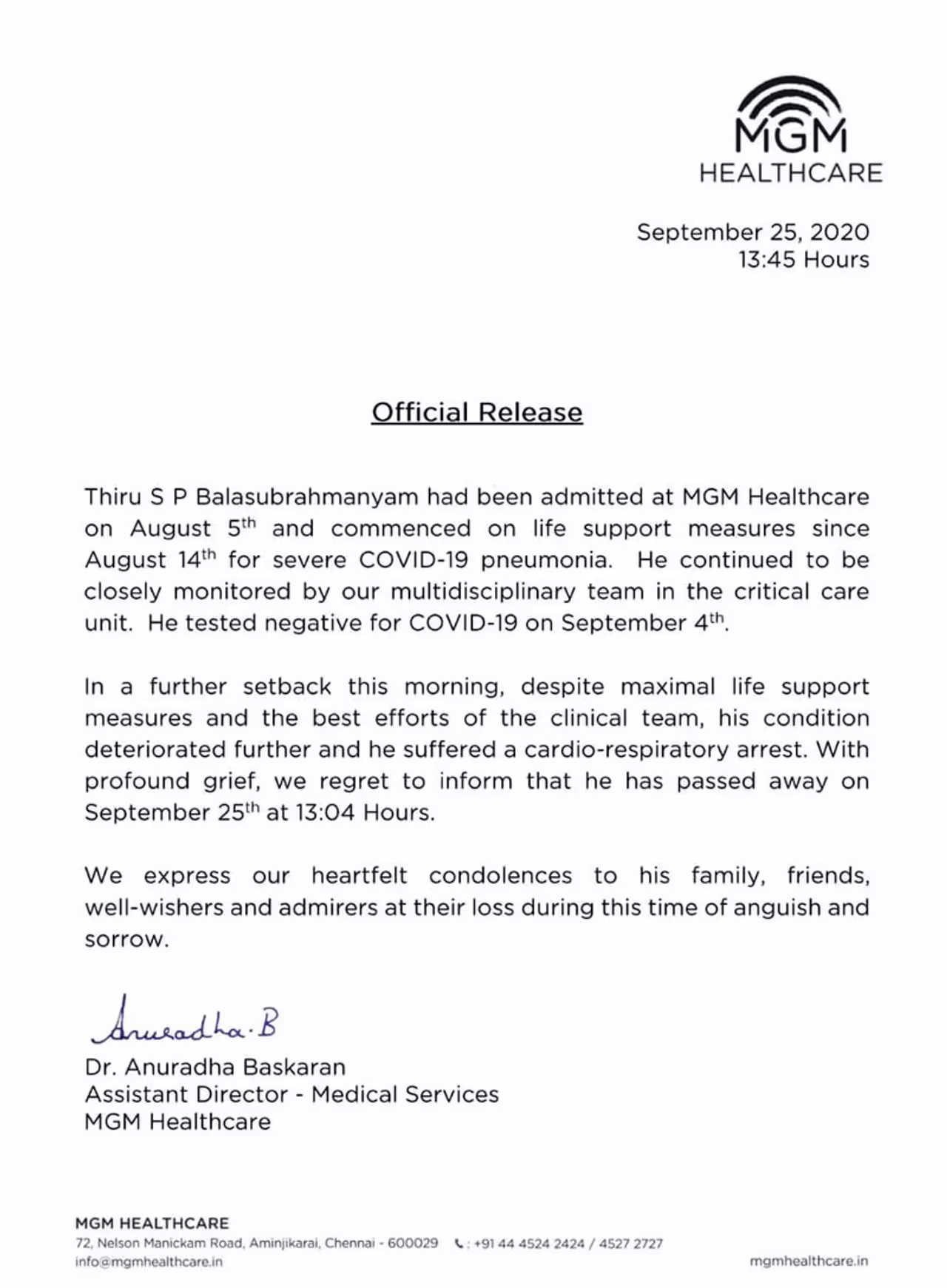 ಹಿರಿಯ ಗಾಯಕ ಎಸ್ಪಿ ಬಾಲಸುಬ್ರಹ್ಮಣ್ಯಂ ವಿಧಿವಶ/ ಕೊರೋನಾ ಕಾರಣ ಆಸ್ಪತ್ರೆಗೆ ದಾಖಲಾಗಿದ್ದರು/ ಚೆನ್ನೈನ ಎಂಜಿಎಂ ಆಸ್ಪತ್ರೆಯಲ್ಲಿ ನಿಧನ/ ಗಾನ ಲೋಕ ತೊರೆದ ಗಂಧರ್ವ