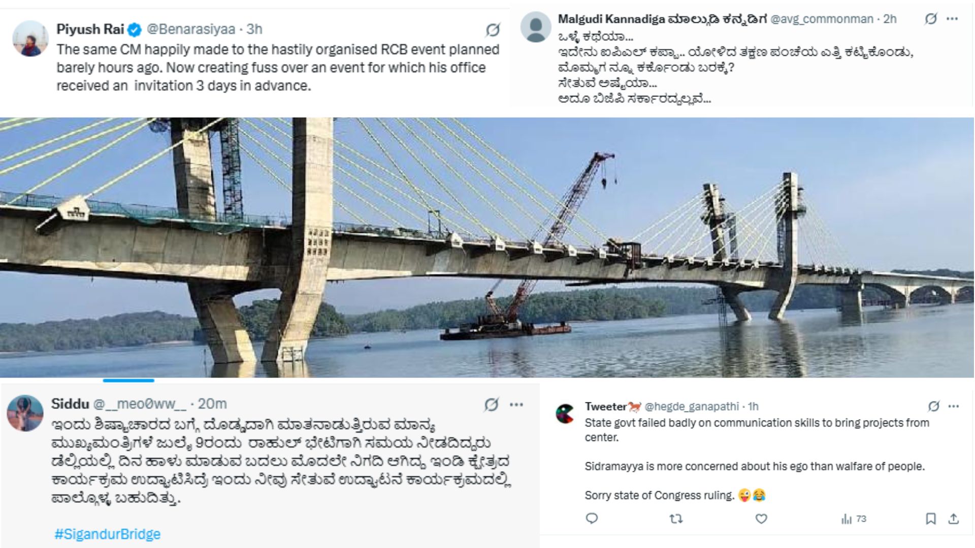 ಸಿಎಂ ಟ್ವೀಟ್ಗೆ ಆಕ್ರೋಶ: ಸೇತುವೆ ಉದ್ಘಾಟನೆ ಬಗ್ಗೆ ಕೇವಲ ಮೂರು ದಿನಗಳ ಮುಂಚೆ ತಿಳಿಸಲಾಯಿತು ಎಂದು ಸಿಎಂ ಸಿದ್ಧರಾಮಯ್ಯ ಹೇಳಿರುವ ಮಾತಿಗೆ ಆಕ್ರೋಶ ವ್ಯಕ್ತವಾಗಿದೆ. ಅದು ಆದ್ಯತೆಯನ್ನು ಅವಲಂಬಿಸಿರುತ್ತದೆ.ತೆರಿಗೆ ಪಾವತಿದಾರರ ಹಣದಿಂದ ನಿರ್ಮಿಸಲಾದ ಯೋಜನೆಗಳನ್ನು ಉದ್ಘಾಟಿಸಲು ನಮಗೆ ಮುಖ್ಯಮಂತ್ರಿ ಅಥವಾ ಪ್ರಧಾನಿ ಅಗತ್ಯವಿಲ್ಲ. ಎಂಜಿನಿಯರ್ಗಳು, ವಾಸ್ತುಶಿಲ್ಪಿಗಳು, ತೆರಿಗೆ ಪಾವತಿದಾರರು ಮತ್ತು ಅದನ್ನು ನಿರ್ಮಿಸಿದ ಕಾರ್ಮಿಕರನ್ನು ಇದಕ್ಕೆ ಆಹ್ವಾನಿಸಬೇಕು' ಎಂದು ಬರೆದಿದ್ದಾರೆ.