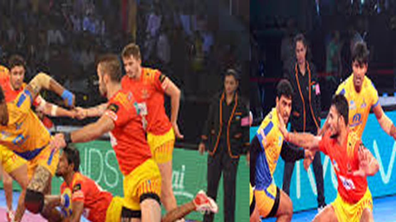 ಇಲ್ಲಿನ ತ್ಯಾಗರಾಜ್ ಒಳಾಂಗಣ ಕ್ರೀಡಾ ಸಂಕೀರ್ಣದಲ್ಲಿ ನಡೆದ ಮೊದಲ ಪಂದ್ಯದಲ್ಲಿ ಬಲಿಷ್ಠ ಗುಜರಾತ್ ಫಾರ್ಚೂನ್’ಜೈಂಟ್ಸ್ ತಂಡವನ್ನು 35-34 ಅಂಕಗಳಿಂದ ಮಣಿಸುವಲ್ಲಿ ತಮಿಳ್ ತಲೈವಾಸ್ ಯಶಸ್ವಿಯಾಯಿತು. ಮೊದಲಾರ್ಧದ 7ನೇ ನಿಮಿಷದಲ್ಲಿ ಸುಕೇಶ್ ಹೆಗ್ಡೆ ನೇತೃತ್ವದ ಗುಜರಾತ್ ಫಾರ್ಚೂನ್’ಜೈಂಟ್ಸ್ 7-6 ಅಂಕಗಳ ಮುನ್ನಡೆ ಕಾಯ್ದುಕೊಂಡಿತ್ತು. 11ನೇ ನಿಮಿಷದಲ್ಲಿ ತಮಿಳ್ ಟೈಟಾನ್ಸ್ ತಂಡವನ್ನು ಆಲೌಟ್ ಮಾಡಿದ ಗುಜರಾತ್ 13-6ಕ್ಕೆ ಅಂಕ ಹೆಚ್ಚಿಸಿಕೊಂಡಿತು. ಗುಜರಾತ್ ಪರ ಮಿಂಚಿನ ದಾಳಿ ನಡೆಸಿದ ಯುವ ಆಟಗಾರ ಸಚಿನ್ ತಂಡಕ್ಕೆ ನೆರವಾದರು. ಮೊದಲಾರ್ಧ ಮುಕ್ತಾಯದ ವೇಳೆಗೆ ಗುಜರಾತ್ ಫಾರ್ಚೂನ್’ಜೈಂಟ್ಸ್ 20-13 ಅಂಕಗಳ ಮುನ್ನಡೆ ಕಾಯ್ದುಕೊಂಡಿತ್ತು.