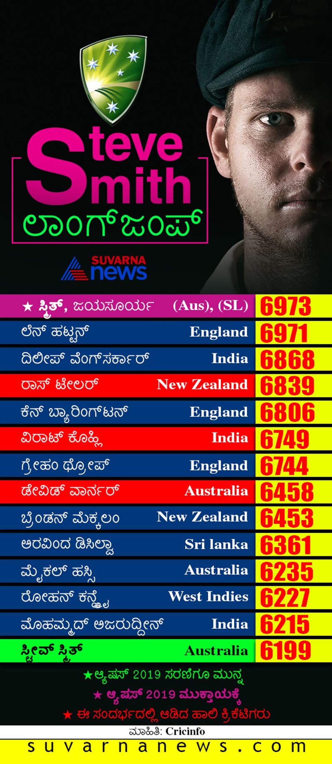 ಒಂದೇ ಸರಣಿಯಲ್ಲಿ 12 ಆಟಗಾರರನ್ನು ಹಿಂದಿಕ್ಕಿದ ಸ್ಮಿತ್: ಬಾಲ್ ಟ್ಯಾಂಪರಿಂಗ್ ಮಾಡಿ ಒಂದು ವರ್ಷ ನಿಷೇಧಕ್ಕೆ ಗುರಿಯಾಗಿದ್ದ ಸ್ಟೀವ್ ಸ್ಮಿತ್ ತಾವಾಡಿದ ಮೂರನೇ ಟೆಸ್ಟ್ ವೇಳೆಗೆ ಮತ್ತೆ ಐಸಿಸಿ ನಂ.1 ಪಟ್ಟಕ್ಕೇರುವಲ್ಲಿ ಯಶಸ್ವಿಯಾಗಿದ್ದರು. ಇನ್ನು ಆ್ಯಷಸ್ ಸರಣಿ ಆರಂಭಕ್ಕೂ ಮುನ್ನ ಸ್ಮಿತ್ 6,199 ಬಾರಿಸಿದ್ದರು. ಇದಾದ ಬಳಿಕ ಆ್ಯಷಸ್ ಮುಕ್ತಾಯದ ವೇಳೆಗೆ ಬರೋಬ್ಬರಿ 12 ಆಟಗಾರರನ್ನು ಹಿಂದಿಕ್ಕಿ 6973 ರನ್ ಬಾರಿಸಿದ್ದಾರೆ. ಇನ್ನು ತಮಗಿಂತ ರನ್ಗಳಿಕೆಯಲ್ಲಿ ಮುಂದಿದ್ದ, ಇದೇ ವೇಳೆ ಟೆಸ್ಟ್ ಪಂದ್ಯಗಳನ್ನಾಡುತ್ತಿದ್ದ ರಾಸ್ ಟೇಲರ್, ವಿರಾಟ್ ಕೊಹ್ಲಿ, ಡೇವಿಡ್ ವಾರ್ನರ್ ಅವರನ್ನು ಹಿಂದಿಕ್ಕುವಲ್ಲಿ ಸ್ಮಿತ್ ಸಫಲರಾಗಿದ್ದಾರೆ.