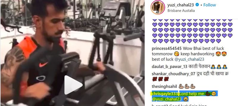 ಜಿಮ್ನಲ್ಲಿ ವರ್ಕೌಟ್ ಮಾಡುತ್ತಿರುವ ಫೋಟ್ ಆಪ್ಲೋಡ್ ಮಾಡಿದ್ದ ಯಜುವೇಂದ್ರ ಚೆಹಾಲ್ಗೆ ಕ್ರಿಸ್ ಗೇಲ್ ಪ್ರತಿಕ್ರಿಯಿಸಿದ್ದಾರೆ. ಆಸಿಸ್ ವಿರುದ್ಧದ ಸರಣಿಗೆ ಸಮರಾಭ್ಯಸ ಎಂದು ಚೆಹಾಲ್ ಇನ್ಸ್ಟಾಗ್ರಾಂನಲ್ಲಿ ವೀಡಿಯೋ ಅಪ್ಲೋಡ್ ಮಾಡಿದ್ದಾರೆ.